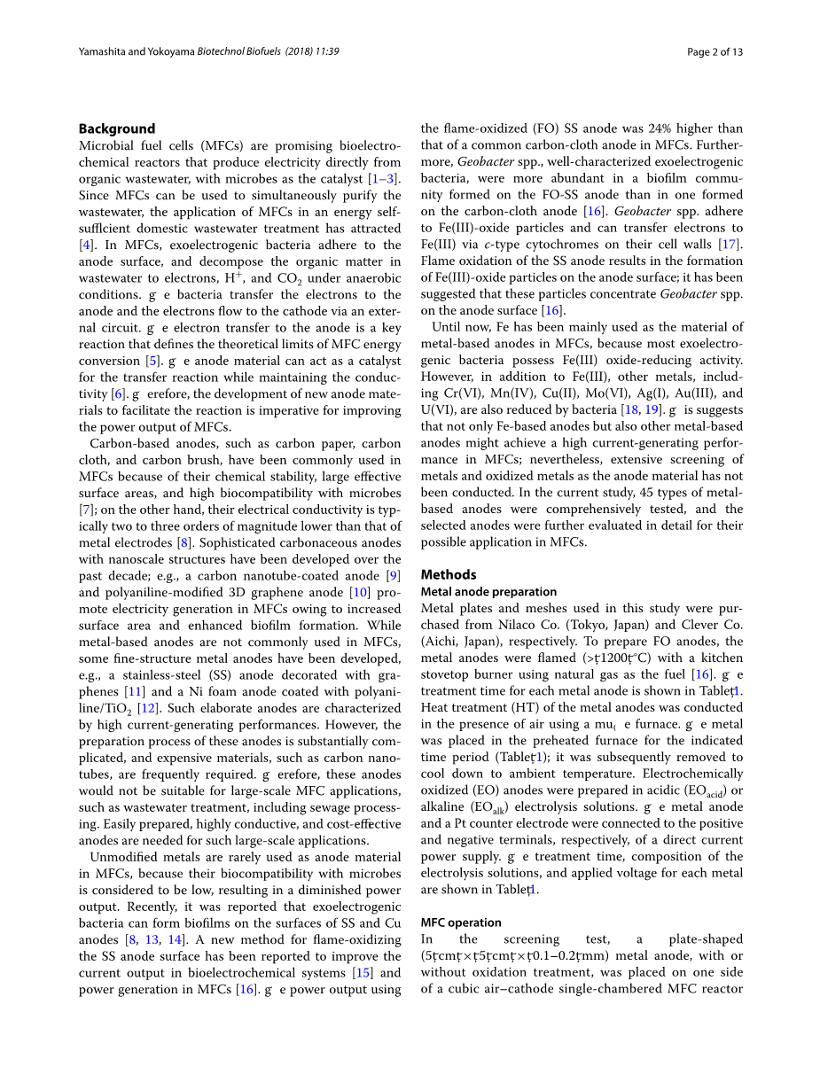 使用表面氧化(FO)SS阳极的输出功率比MFC中普通碳布阳极的功率高24%。此外,Geobacter 菌群是特征明确的产电细菌,在FO-SS阳极上形成的生物膜比在碳布阳极上形成的生物膜生长得更好。地衣杆菌附着于Fe(III)-氧化物颗粒并且可以通过它们的细胞壁上的C型细胞色素将电子转移到Fe(III)上。SS阳极的表面氧化导致在阳极表面上形成Fe(III)氧化物颗粒;有人提出这些颗粒将阳极表面的Geobacter菌种集中。