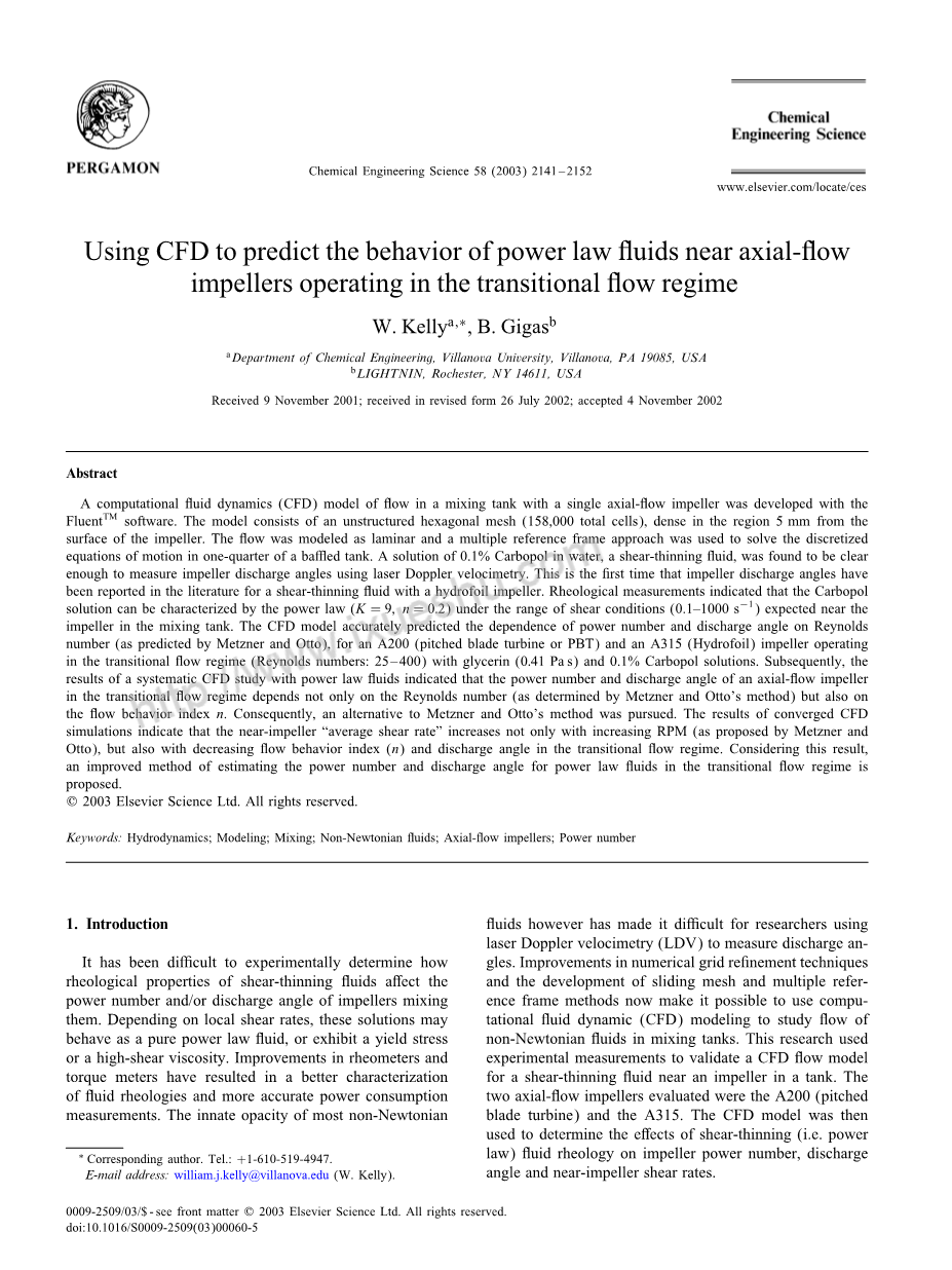 这项研究的目标有三个:(1)了解CFD模型如何准确预测轴流式叶轮(A315和A200)的功率数和放电角与幂律流体的关系;(2)使用CFD建模的结果来确定在过渡流动状态下近叶轮“平均剪切速率”是否真的只是叶轮转速的线性函数(如Metzner和Otto提出的那样);(3)利用CFD建模的结果确定一种改进的方法,用于估算剪切稀化幂律流体的过渡流体系中功率数对Re的依赖性。为了完成这项研究,采用了最先进的实验设备和CFD软件(FluentTM)。