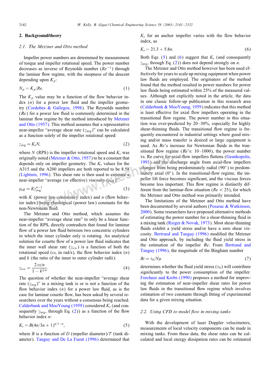 从Bertrand和Tanguy(1996),Bingham数的大小决定了流体屈服应力(tau;0)是否会对叶轮的功率消耗产生显著影响。Forchner和Krebs(1990)提出了一种改进过渡流体系中幂律流体的近叶轮剪切速率估算的方法,该方法包括通过拟合给定混合情况的实验数据来估计两个常数。