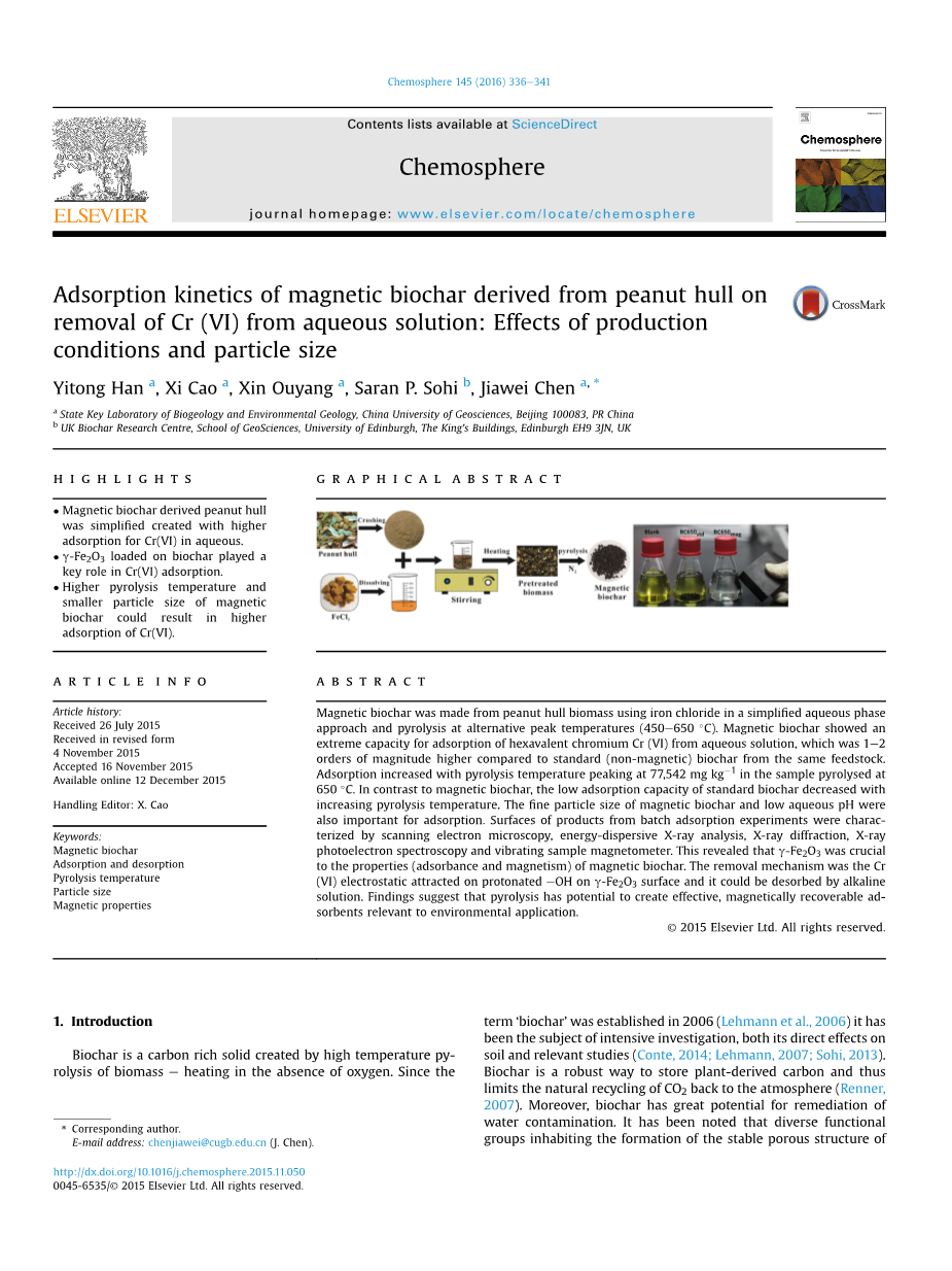 在之前的报道中,有人提到了生物炭吸附Cr(VI)的一般能力。铬是水中常见的金属污染物,生物炭在此领域的潜在作用被人们注意着。举例说,结果从123 mg·g-1的甜菜尾渣(Dong et al., 2011)的生物炭,到64.1 mg·g-1的污水污泥生物炭(Agrafioti et al., 2014a, 2014b),从主要粮食作物的残留物中获得23.1 mg·g-1的生物炭,比如米糠(Ma et al., 2014)。这样的原料价格都很低,而且其成熟的市场使其具有丰富的来源。这改善了生物炭制造对于专用生物质资源的经济情况,使这一技术得到了更广泛的测试。无论如何,为了补救那些流失的水和土地,生物炭需要更高的多的吸附量。因此,简化生物炭的制备过程是重要而紧迫的。