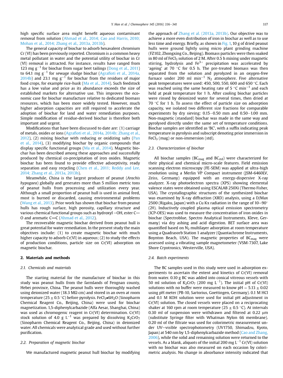 在本论文的研究中,生物炭的制备原料是来自中国河北省冯南村农田的花生壳。花生壳被去离子水彻底地清洗过(18.3 MOmega; cm),在热解之前被保留在处于室温(25 plusmn; 0.5 °C)的烤箱内。FeCl3bull;6H2O (Sinopharm Chemical Reagent Co., Beijing, China)是用来作为磁化的原料。1,5-二苯卡巴肼(Alfa Aesar, Shanghai, China)在Cr(VI)的吸附实验中作为显色剂使用。铬原液使用 K2CrO7 (Sinopharm Chemical Reagent Co., Beijing, China)溶解在去离子水中,浓度为 4.0 g·Lminus;1。以上所有化学品都是分析纯级的,并没有进行进一步提纯。