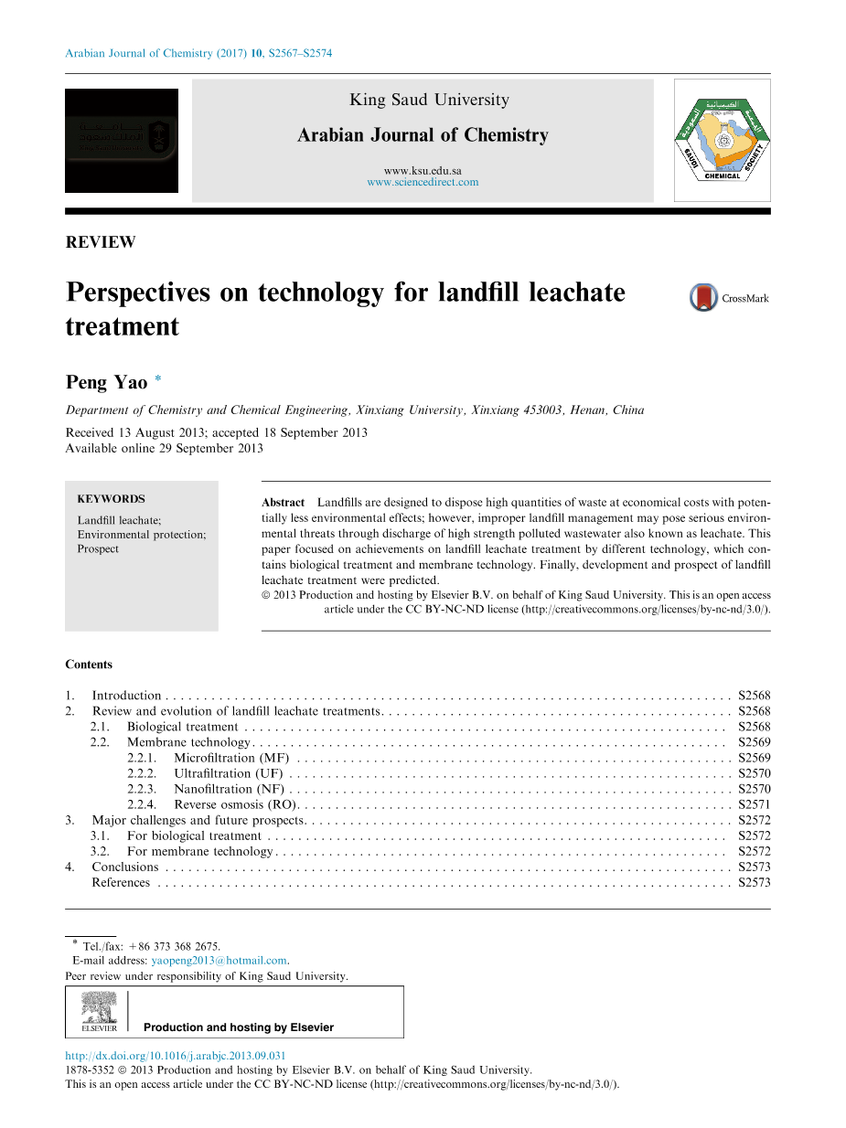 摘要:垃圾填埋场旨在以经济成本处理大量废物,并可能降低环境影响;然而,不适当的填埋管理可能会通过排放高浓度污染废水(也称为垃圾渗滤液)造成严重的环境威胁。这个论文重点研究了不同技术处理垃圾渗滤液的成果,包括生物处理和膜技术。最后是垃圾填埋场的发展和展望预测渗滤液处理。