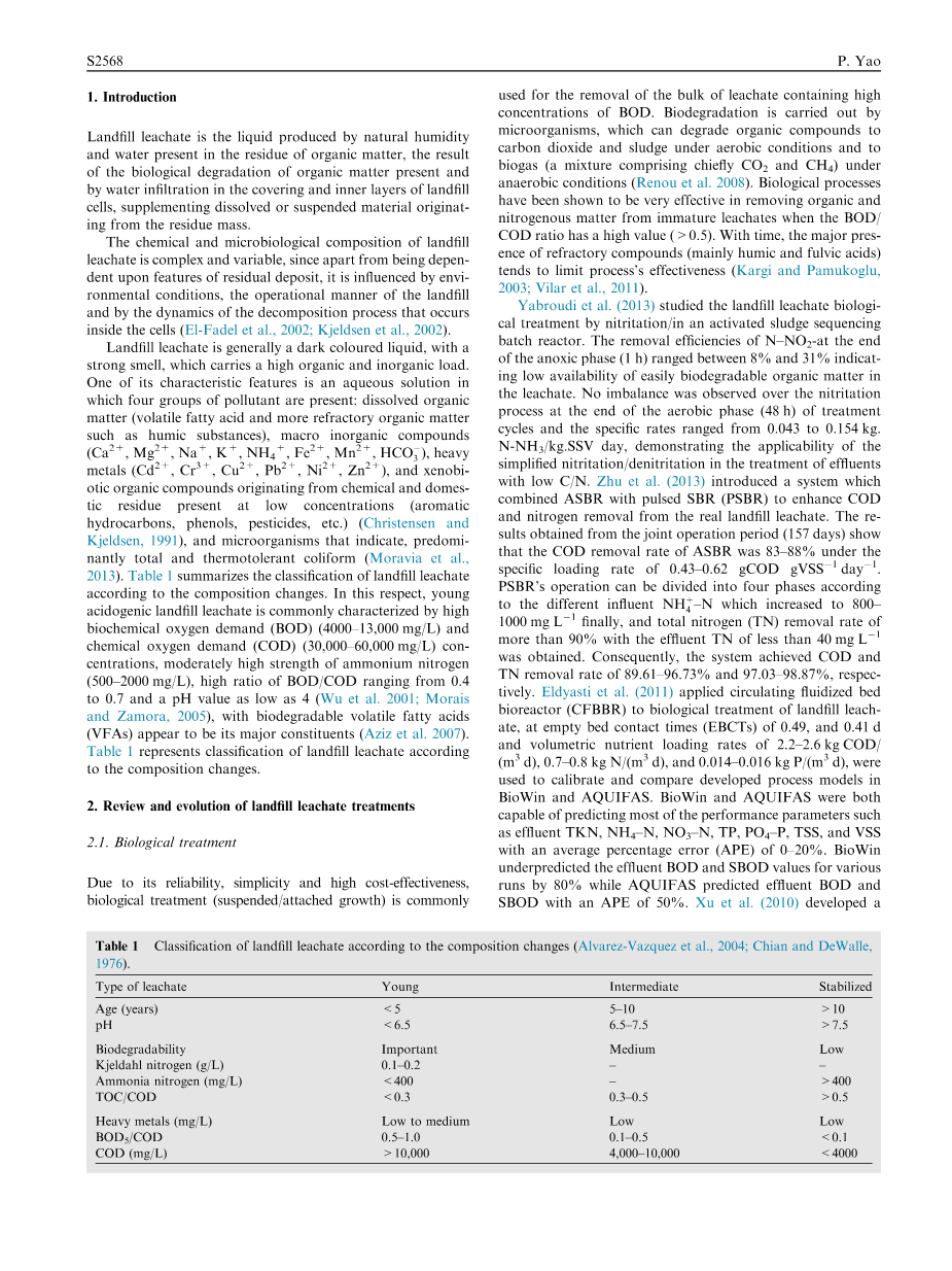 由于其可靠性,简单性和高成本效益,生物治疗(暂停/附着生长)是常见的用于去除含有高含量渗滤液的大部分BOD浓度。生物降解通过微生物,它可以在有氧条件下进行降解有机化合物二氧化碳和污泥。沼气(主要包括CO2和CH4的混合物)厌氧条件(Renou等2008)。生物过程已被证明是非常有效的去除有机物质。来自未成熟渗沥液的含氮物质,当BOD/COD比值高(gt;0.5)。随着时间的推移,难熔化合物(主要是腐殖酸和富里酸)往往会限制过程的有效性(Kargi和Pamukoglu,2003;Vilar等,2011)Yabroudi等人(2013)通过亚硝化/活性污泥测序研究了垃圾填埋场渗滤液生物处理间歇反应器。N-NO2-在最后的去除效率的缺氧阶段(1小时)介于8%和31%之间,表明低可用性的易生物降解有机物质渗滤液。没有观察到亚硝酸盐失衡过程在好氧阶段(48小时)的治疗结束时进行周期和具体比率范围从0.043至0.154公斤。N-NH3/kg.SSV,证明了该方法的适用性简化处理污水中低C/N的亚硝酸盐/亚硝酸盐。朱等人(2013年)推出了一个系统将ASBR与脉冲式SBR(PSBR)组合以提高COD并从真正的垃圾填埋场渗滤液中除氮。从联合运营期(157天)获得的结果显示在ASBR的COD去除率为83-88%具体加载速率为0.43-0.62gCODgVSS1天1。根据PSBR的操作可分为四个阶段到不同的进水氨氮增加到800-1000mg/L,总氮(TN)去除率为100%超过90%,出水TN小于40毫克/升被获得。因此,该系统实现了COD和TN去除率分别为89.61-96.73%和97.03-98.87%。Eldyasti等人(2011)采用循环流化床生物反应器(CFBBR)对垃圾渗滤液进行生物处理,空床接触时间(EBCTs)为0.49和0.41d体积营养负荷率为2.2-2.6千克COD/(m3d),0.7-0.8kg·N/(m3d)和0.014-0.016kgP/(m3d),分别为用于校准和比较中开发的过程模型BioWin和AQUIFAS。BioWin和AQUIFAS都是能够预测大多数性能参数等作为出水TKN,NH4-N,NO3-N,TP,PO4-P,TSS和VSS平均百分比误差(APE)为0-20%。BIOWIN低估了各种污水的BOD和SBOD值运行80%,而AQUIFAS预测出水BOD和SBOD的APE为50%。Xu等人(2010年)制定了一项将SBR中的部分硝化,厌氧氨氧化(Anammox)和异养反硝化结合起来进行生物处理,处理垃圾渗滤液。工作温度为30plusmn;1℃和溶解氧浓度在SBR中维持1.0-1.5mg/L。首先,混合物的Anammox生物质和好氧活性污泥(80%)被接种,并且添加逐渐增加的N-负载的无机合成废水。的活动最大好氧铵氧化和厌氧铵氧化达到0.79和0.18(kgNH4 -N/kgdw/天)接种后分别持续86天。其次,一个出乎意料的异养反硝化细菌群随着原料垃圾填埋场渗滤液的加入,接种到反应器中,最终达到有氧最大活性铵氧化,厌氧铵氧化和反硝化达到2.83(kgNH 4-N/kgdw/天),0.65(kgNHthorn;4-N/kgdw/天)和0.11(kgNo3-N/kgdw/天)。Yahmed等人。(2009年)使用有氧试验装置进行JebelChekir垃圾渗滤液(突尼斯)处理浸入式和固定式生物膜反应器。初步分析,表明渗滤液中可生物降解的部分很高(BOD5/COD=0.4),这意味着生物治疗过程可以应用。在执行期间获得的业绩这项研究表明显着的有机物质减少;TOC降低60%至90%。然而,一个财团包含细菌的混合物接种在原浸出液中的菌株,达到TOC收率约84%。Trabelsi等人(2009)研究了缺氧消化基于批量反应器中的内生生物质活性(V=150L)用于处理JebelChekir垃圾填埋场(突尼斯)的垃圾渗滤液。保留时间为90天,缺氧消化反应器显示BOD5,COD,TOC,NH4--N和TKN分别下降91%,46%,65%、45%和63%。之后,污水进一步处理在三个充气式淹没式生物反应器中流动级联,总保留时间为7天。进一步减少这些参数在好氧反应器中实现,并且由缺氧和好氧反应器的耦合系统实现的总体去除效率对于BOD5为95%,对于BOD5为94%NH4 -N的COD和92%。而且,后期治疗的目的在粉末上吸附去除重金属活性炭(PAC)也在这项工作中进行了研究被发现是有效的,以提高去除COD高达a总减少量为99.7%。孙等人(2009a,b)调查了亚硝酸盐积累序批式反应器(SBR)反硝化过程在缺氧/厌氧条件下处理预处理的垃圾填埋场渗滤液。