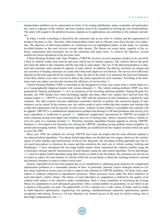 车辆路径问题(VRP)被描述为从中央仓库到具有各种需求的一组地理上分散的点的最低成本路线的指定[4]。车辆路径问题(VRP)最初由Dantzig和Ramser [5]提出。这是旅行商问题的延伸。在过去的五十年中,VRP模型得到了迅速发展,许多其他新模型也源于这一原始模型[6]。VRPTW是VRP的扩展,插入了每个客户所需的时间边界。时间窗成为附加约束,由此在实践中可以改变时间窗的限制程度。在极端情况下,车辆需要在时间窗内到达,违反此要求的车辆将被拒绝。在大多数情况下,违反时间窗口是可以接受的,但会受到处罚。VRPTW是一个组合优化问题,属于NP难问题,通过精确算法求解它一般是低效的[7]。在VRPTW中遇到的其他复杂性是由车辆时间窗口和等待时间成本引起的路线约束的长度,这是在车辆到达客户位置太早时产生的[8]。因此,启发式算法在解决VRPTW时变得流行。Solomon [9]开发了一些用于解决VRPTW的启发式方法,包括保存方法,最近邻插入和扫描方法。这些启发式算法是从用于解决VRP的原始版本修改的。