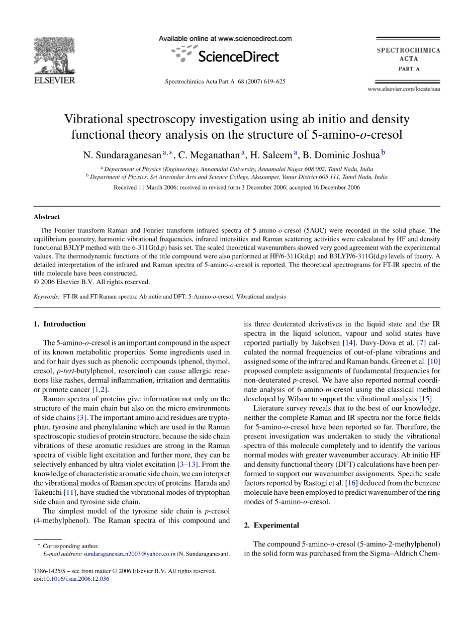 这种化合物及其三种氘代衍生物在液态下的拉曼光谱和液体溶液,蒸气和固态下的红外光谱已由Jakobsen报道[14]。Davy-Dova等人[7]计算了平面外振动的正常频率并分配了一些红外和拉曼频带。Green等人[10]提出了非氘代对甲酚基本频率的完整分配。我们还报告了用Wilson开发的经典方法对6-氨基间甲酚的正常坐标分析,以支持振动分析[15]。
