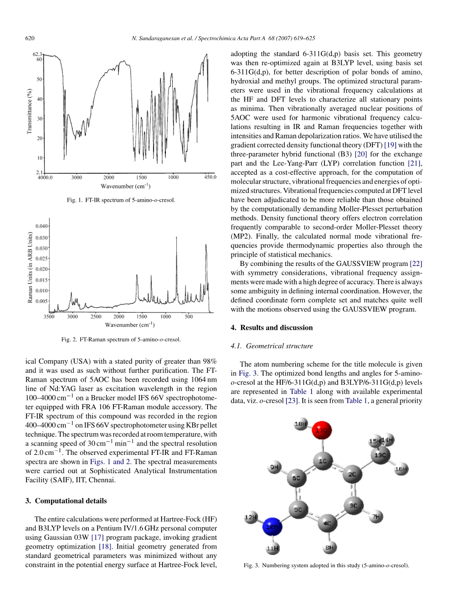 整个计算是在PentiumIV/1.6GHz个人计算机上使用Gaussian03W[17]程序包在Hartree-Fock(HF)和B3LYP水平上进行的,调用梯度几何优化[18]。采用标准的6-311G(d,p)基组,在Hartree-Fock水平的势能面上没有任何限制地将由标准几何参数产生的初始几何结构最小化。然后使用基组6-311G(d,p)在B3LYP水平上再次重新优化该几何形状,以更好地描述氨基,羟基和甲基的极性键。在HF和DFT水平的振动频率计算中使用优化的结构参数来将所有静止点表征为最小值。然后将振动平均的5AOC核位置用于谐振频率计算,得到IR和拉曼频率以及强度和拉曼去极化比。我们利用梯度修正密度泛函理论(DFT)[19]和交换部分的三参数混合功能(B3)[20]和Lee-Yang-Parr(LYP)相关函数[21]一种经济有效的方法,用于计算优化结构的分子结构,振动频率和能量。振动频率计算出来的水平已经被判定为比通过计算要求的莫勒-普莱塞斯扰动方法获得的更可靠。密度泛函理论提供的电子相关性经常与二阶Moller-Plesset理论(MP2)相当。最后,计算的正常模式振动频率也通过统计力学原理提供热力学性质。