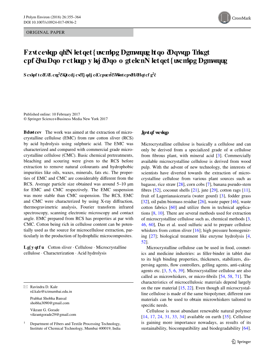 - 本研究的目的是用棉条进行酸水解制备微晶纤维素。我们使用棉条而不是用木浆的原因是木浆是不可再生资源。用于生产棉纤维的棉条原料来自于棉花豆荚,是一种可以补充的自然资源。棉条是棉纺织工业的重要组成部分。这是一束很长的纤维,通常用于纺纱,它是由纤维的精梳制成,然后被拉伸成长的条状,纤维是平行的。我们利用棉条来提取微晶纤维素,因为它很便宜,很容易得到,而且所有物理杂质都可通过机械加工除去。在提取了微晶纤维素之后,再与商业级的微晶纤维素(CMC)进行物理和化学性质的比较。