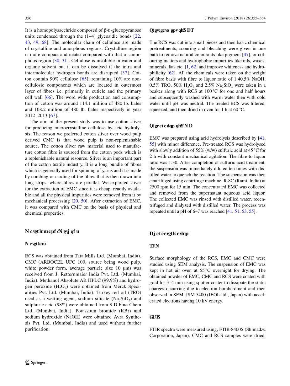 - 提取的微晶纤维素(EMC)是根据【41 55】的方法稍作改变制备而成。经由预处理过后的生棉条(RCS)在45℃下缓慢加入55%的硫酸,持续机械搅拌2个小时,进行酸水解。纤维素和液体的比例是1:30.在硫酸处理完成后,立即用蒸馏水稀释10次,以抑制反应。然后用R-8C(印度,拉米)离心机,在每分钟2500rpm的转速下离心15分钟。从上清液中取出并收集高浓度的提取微晶纤维素(EMC)。将收集到的微晶纤维素(EMC)用蒸馏水漂洗,再次离心并用蒸馏水进行透析。反复进行操作,知道PH达到6-7呈中性。