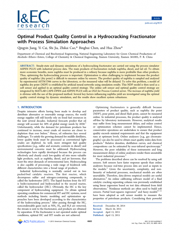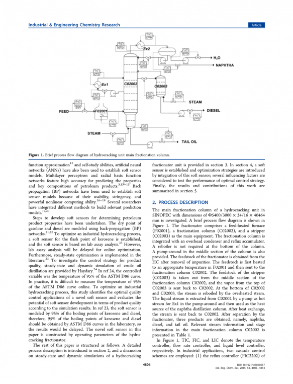 已经开发了用于开发用于确定石油产品性质的软传感器的步骤。使用反向传播(BP)网络模拟汽油和柴油的干点。21,22为了优化工业加氢裂化过程,建立了用于煤油闪点的软传感器,软传感器基于实验室分析。23然而,实验室对于在线优化的分析存在延迟。此外,文献中还实施了稳态优化。23为了研究产品质量的控制策略,Haydary提供了原油蒸馏的稳态模拟和动态模拟。24在参考文献24中,被控变量为ASTM D86曲线95%的温度。在实践中,很难在线测量95%的ASTM D86曲线温度。为了优化工业加氢裂化工艺,本研究确定了新型软传感器的最佳质量控制应用,并根据模拟结果评估软传感器开发在产品质量方面的潜力。在参考文献23中,软传感器由煤油和柴油的95%沸点建模,因此,95%的煤油和柴油的沸点应通过ASTM D86曲线在实验室中获得,因此结果将存在延迟。本文的新型软传感器是由加氢裂化分馏塔的操作参数构成的。