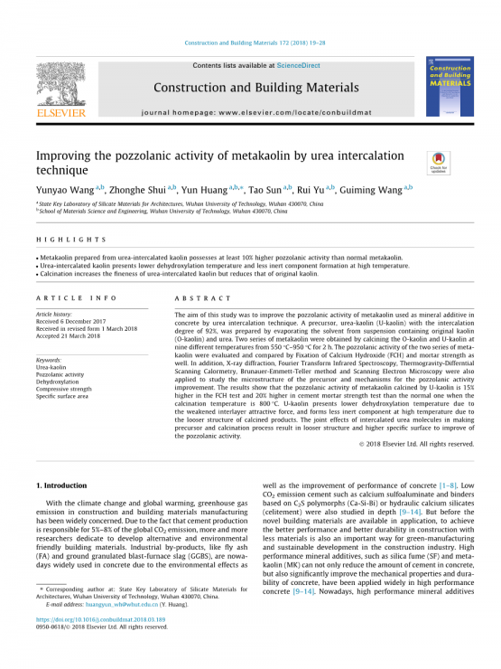 有许多新闻报道了高岭土插层复合物在各种领域的应用,如有毒离子吸收剂,纳米复合物和纳米复合物的前体,纸张涂层剂等。但目前很少有关于通过插层技术促进偏高岭土火山活性的文献。由于高岭石层的剥落和插层过程中的紊乱增加,它可能具有巨大的潜力改善偏高岭土的火山灰活性。本研究的目的是通过使用尿素 - 高岭土插层技术改善偏高岭土的火山灰活性,并开发用于建筑和建筑材料的高性能矿物添加剂。制备U-高岭土作为前体并在不同温度下煅烧以获得偏高岭土。从机械性能和氢氧化钙消耗的角度,使用抗压强度结合使用Chapelle测试NF P18-513来评价偏高岭土的火山灰活性。还采用了多种分析技术来研究所涉及的机制
