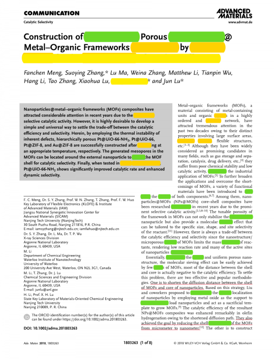 基本上,鉴于致密且均匀的多孔纳米结构,通过几层MOF可以容易地实现分子筛分效果,壳和核之间的大部分距离实际上对催化效率是负的。为了解决这个问题,有两种有效且流行的方法。一是缩短MOF壳与纳米粒子核之间的扩散距离。基于这一策略,Liu和同事提出通过使用金属氧化物作为载体同时加载纳米颗粒并作为牺牲模板来生长MOF来操纵纳米颗粒的空间定位。[9]由于扩散路径缩短,所得NPs @ MOFs复合材料的催化效率在烯烃加氢中显着提高。他们还通过将MOF的外壳尺寸从微米减小到纳米来实现目标。[12]另一种是构建NPs @ MOFs的层次多孔结构,它可以为扩散提供大孔,为选择性提供小孔。[13]例如,Wang及其同事报道了一系列通过溶剂热方法制备的空心NP @ FeIII-MOF-5。[14]与PdCu树枝状晶体相比,所制备的PdCu @ FeIII-MOF-5在1-氯-2-硝基苯的选择性氢化中表现出高得多的催化活性和效率。这归因于纳米颗粒和MOF表面之间形成的巨大空腔,这加速了氢化过程。在我们之前的工作中,Pt @ meso-ZIF-8也通过选择性蚀刻掺入的Au纳米颗粒成功地实现,其表现出提高的催化速率和在烯烃氢化反应中的良好选择性。[15]尽管迄今取得了进展,但这些方法通常需要昂贵且繁琐的过程,这些过程不是普遍的,也不是实际的。