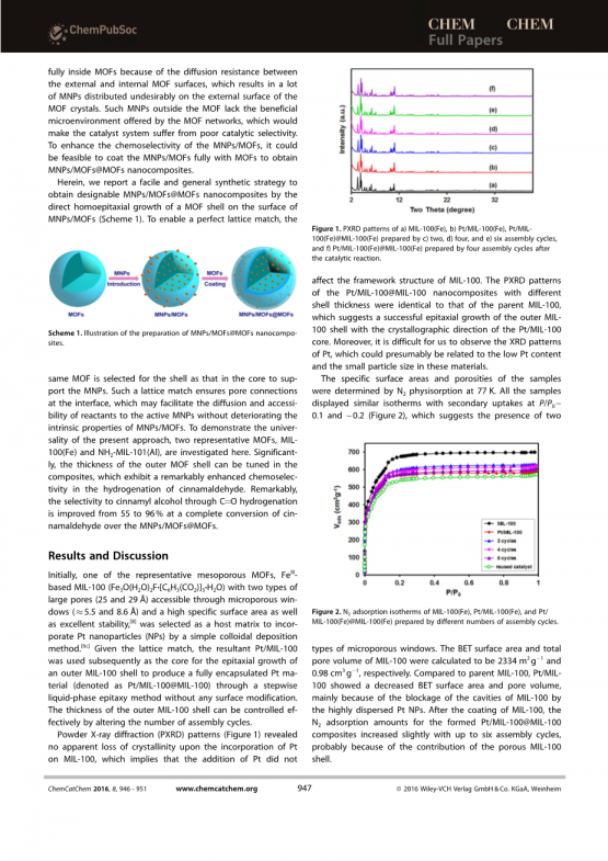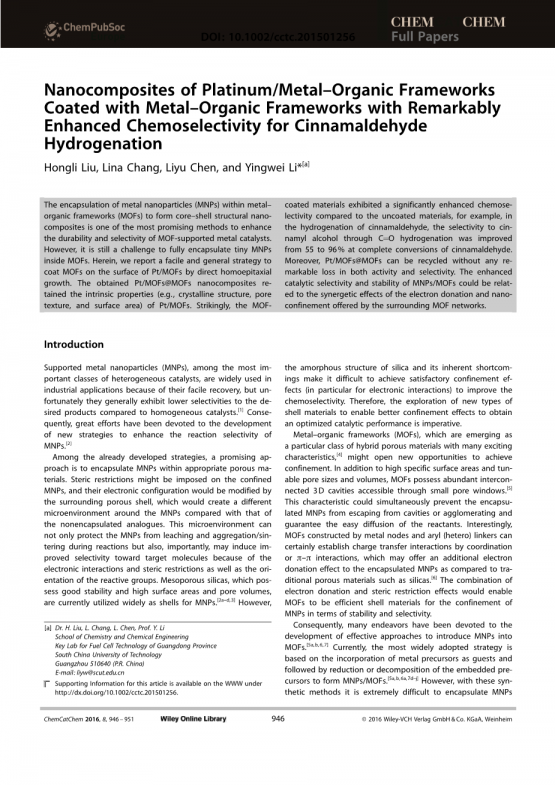 将金属纳米颗粒(MNPs)包裹在金属有机骨架(MOFs)中形成核壳结构纳米复合材料是提高金属纳米载体催化剂耐久性和选择性的有效方法之一。然而,将微型金属纳米颗粒(MNPs)完全封装到MOFs中仍然是一个挑战。在此,我们报告了一种简单而通用的策略,通过直接的同质外延生长在Pt/MOFs表面覆盖MOFs。得到的Pt/MOFs@MOFs纳米复合材料保留了Pt/MOFs的固有性质(如晶体结构、孔隙结构、表面积等)。引人注目的是,与未包覆的材料相比,MOF包裹材料的化学选择性明显增强,例如在肉桂醛的加氢反应中,肉桂醛完全转化时,C=O加氢对肉桂醇的选择性从55%提高到96%。此外,Pt/MOFs@MOFs在活性和选择性方面都没有显著的损失。MNPs/MOFs的催化选择性和稳定性的增强可能与周围MOF网络提供的电子转移和纳米约束的协同效应有关。