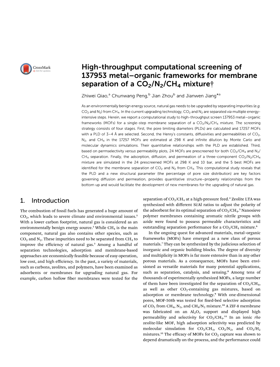 在这项研究中,我们的目标是在单步渗透过程中同时从三组分CO2/N2/CH4混合物中分离出CO2和N2,这只能通过膜技术而不是吸附来实现。 在此介绍之后,第2部分描述了137953个MOFs和三种气体(CO2、N2和CH4)的分子模型并概述了筛选策略。在第3节中,估计了无限稀释的扩散系数、亨利常数以及CO2、N2和CH4的渗透率; 提出了CO2/ N2和N2/CH4的扩散、吸附和渗透选择性; Robeson上限以上的数据将被预先筛选。最后,检查预筛选的MOFs对CO2/N2/CH4混合物的分离性能,并确定性能最好的MOFs。在第4节中,对结果进行总结。