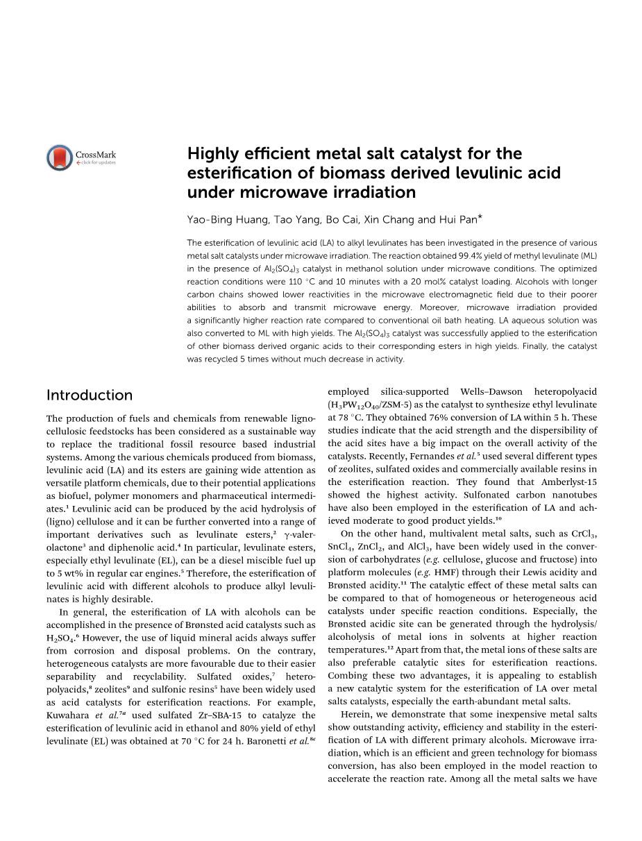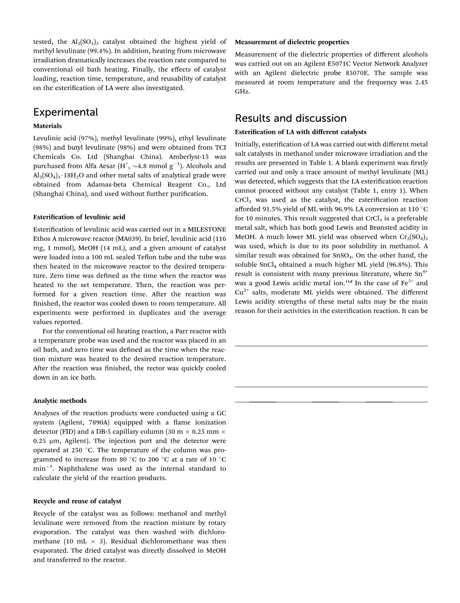 在另一方面,多原子价态的金属盐,比如氯化铬,氯化锡,氯化锌和氯化铝,这些物质都被广泛应用于碳水化合物(例如:纤维素,葡萄糖和果糖)转化成平台分子(羟甲基糠醛)的反应中,以物质的李维斯酸度和质子酸度为基础。在特殊的反应条件下,上述金属盐作为催化剂时能够和那些均相或非均相酸催化剂做对比。特别要提到的是,质子酸性部位可以通过在高温反应条件下的金属离子在溶液中的水解和醇解产生。除此之外,上述盐中的金属离子也在酯化反应中有最好的催化位点。综合上述两个优点,使用金属盐催化剂,特别是地球上那些储量丰富的金属盐,来为乙酰丙酸的酯化反应建立一个新的催化系统是非常吸引人的。
