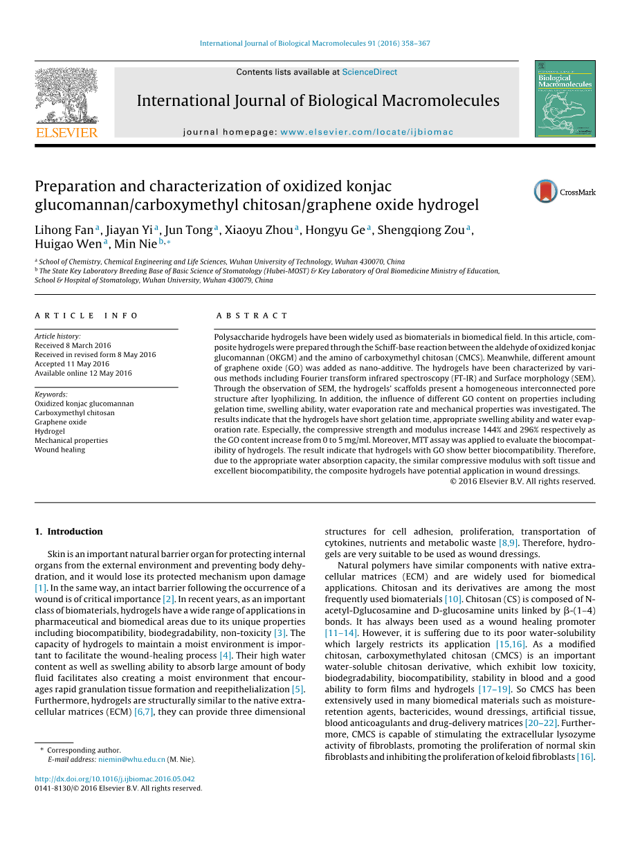 多糖水凝胶已被广泛用作生物医学领域的生物材料。在本文中,通过氧化魔芋醛之间的希夫碱反应制备复合水凝胶葡甘露聚糖(OKGM)和羧甲基壳聚糖(CMCS)的氨基。同时,数量不同的氧化石墨烯(GO)作为纳米添加剂添加。水凝胶通过傅里叶变换红外光谱(FT-IR)和表面形态学(SEM)等多种方法表征。通过观察SEM,水凝胶冷冻干燥后的支架呈现均匀的相互连接的孔隙的结构。此外,不同的GO含量对性能的影响包括凝胶时间,膨胀能力,水蒸发速率和力学性能。该结果表明,水凝胶的凝胶时间短,适宜的溶胀能力和水分蒸发率较好。特别是,抗压强度和模量分别提高了144%和296%GO含量从0增加到5mg / ml。此外,应用MTT分析来评估水凝胶的生物相容性。结果表明,具有GO的水凝胶显示出更好的生物相容性。因此,复合水凝胶由于适当的吸水能力,与软组织的相似压缩模量和优异的生物相容性,具有潜在的应用于伤口敷料。