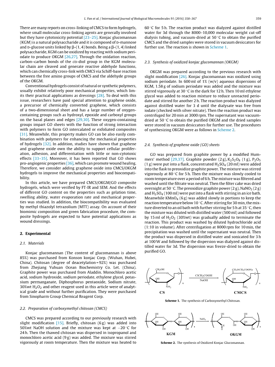 天然聚合物与天然胞外基质(ECM)具有相似的组分,并且广泛用于生物医学应用。壳聚糖及其衍生物是最常用的生物材料[10]。壳聚糖(CS)由N-乙酰基葡糖胺和D-葡糖胺单元通过alpha;-(1-4)链接。它一直被用作伤口愈合促进剂[11-14]。然而,由于其水溶性差,很大程度上限制了其应用[15,16]。作为壳聚糖衍生物,羧甲基壳聚糖(CMCS)是重要的水溶性壳聚糖衍生物,毒性低,生物降解性,生物相容性,血液稳定性好形成薄膜和水凝胶的能力[17-19]。所以CMCS已经广泛用于许多生物医学材料中,如保湿剂,杀菌剂,伤口敷料,人造组织,血液抗凝剂和给药基质[20-22]。此外,CMCS能够刺激细胞外溶菌酶成纤维细胞的活性,促进正常皮肤的增殖成纤维细胞和抑制瘢痕疙瘩成纤维细胞的增殖[16]。关于CMCS交联形成水凝胶的报道很多,通常涉及小分子交联剂但它们具有细胞毒性潜力[23-25]。魔芋葡甘露聚糖(KGM)是一种天然多糖,由D-甘露糖组成和通过alpha;-(1,4)键连接的d-葡萄糖单元。是一个alpha; - (1,4)链接多糖,KGM可以通过与高碘酸钠反应生成OKGM来氧化[26,27]。通过氧化反应,KGM分子链中顺式 - 二醇基团的碳 - 碳键被切割并产生反应性醛官能团,它可以通过席夫碱反应与CMCS化学交联在CMCS的游离氨基和醛基之间的OKGM。