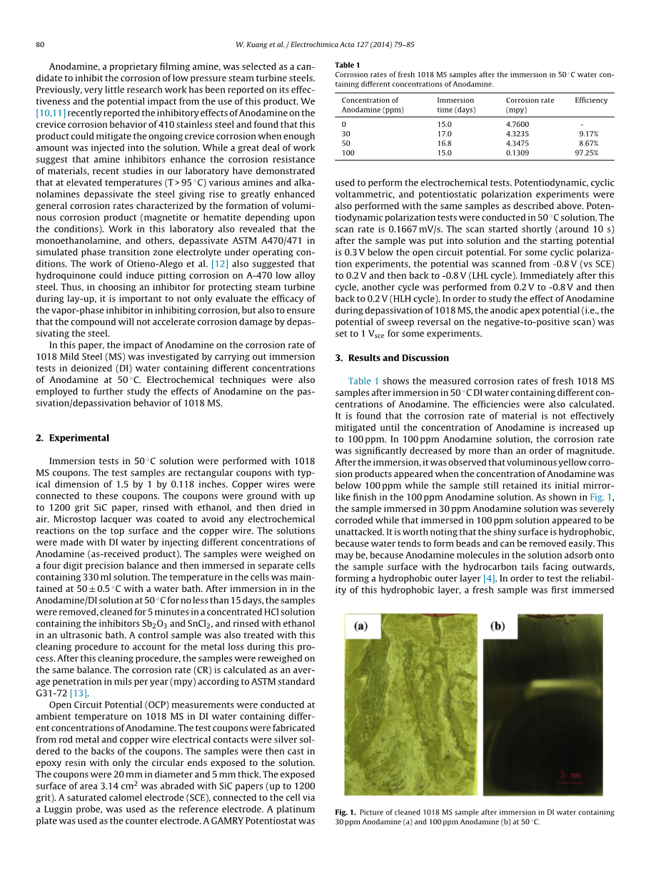 采用1018 MS试片在50℃溶液中进行浸泡试验。测试样品为典型尺寸为1.5times;1times;0.118英寸的矩形试样。铜线连接到这些试片。试片用1200号砂纸打磨,用乙醇冲洗,然后在空气中干燥。 Microstop漆涂覆试片,以避免顶部表面和铜线上的任何电化学反应。通过在去离子水注入不同浓度的Anodamine(收到基产品)制成溶液。样品在精确度为四位小数天平上称重,然后分别浸入含有330ml溶液的电解池中。电解池的温度用水浴保持在50plusmn;0.5◦C。浸入50℃的Anodamine去离子水溶液中不少于15天后,取出样品,在浓HCl溶液中清洗含有抑制剂Sb2O3和SnCl25分钟,并在超声波浴中用乙醇冲洗。对照样本也用这种清洁程序进行处理,以解释此过程中的金属损失。在清洁之后,样品在相同的天平上重新称重。根据ASTM标准G31-72 [13],腐蚀速率(CR)按平均每年(mpy)的平均渗透率计算[13]。
