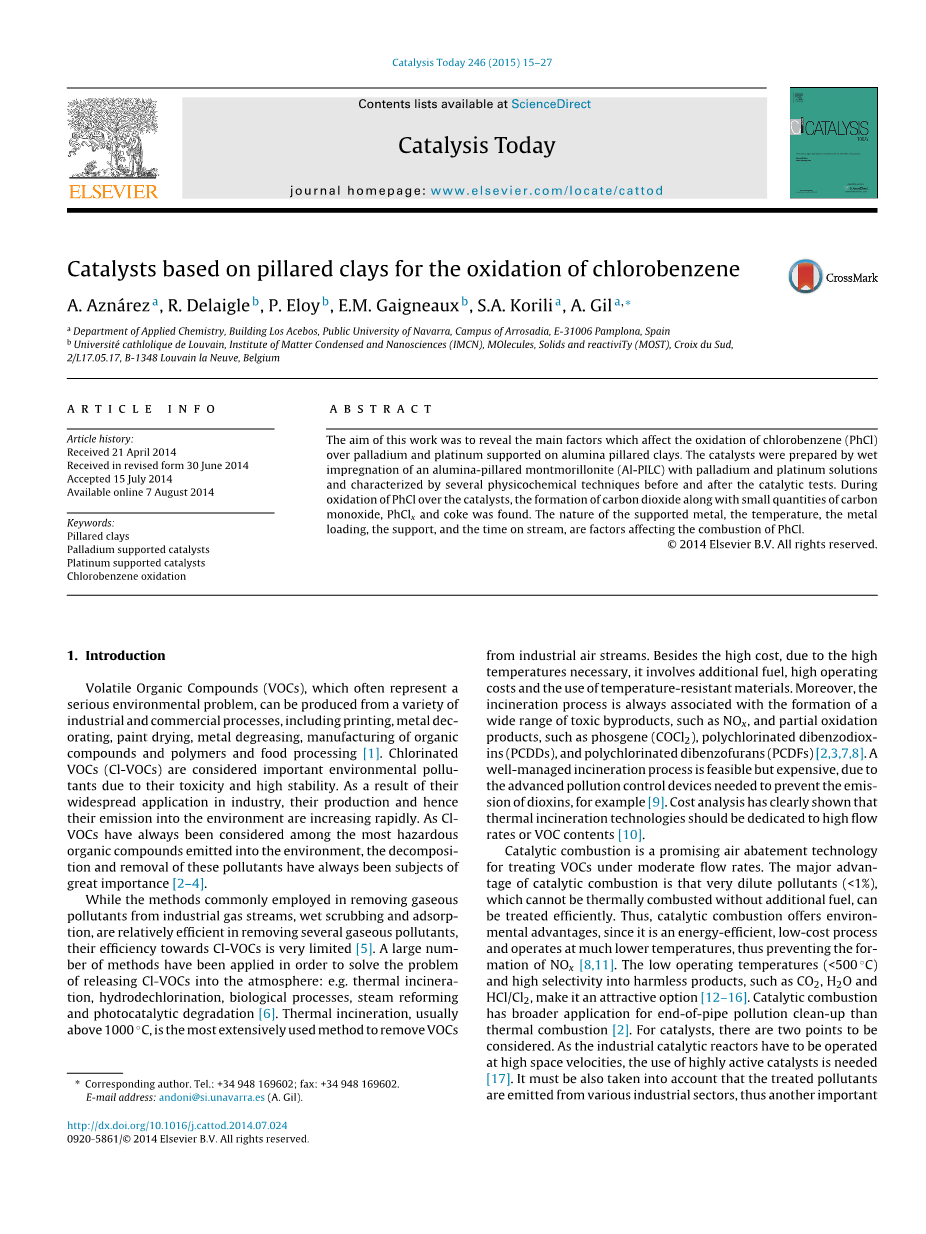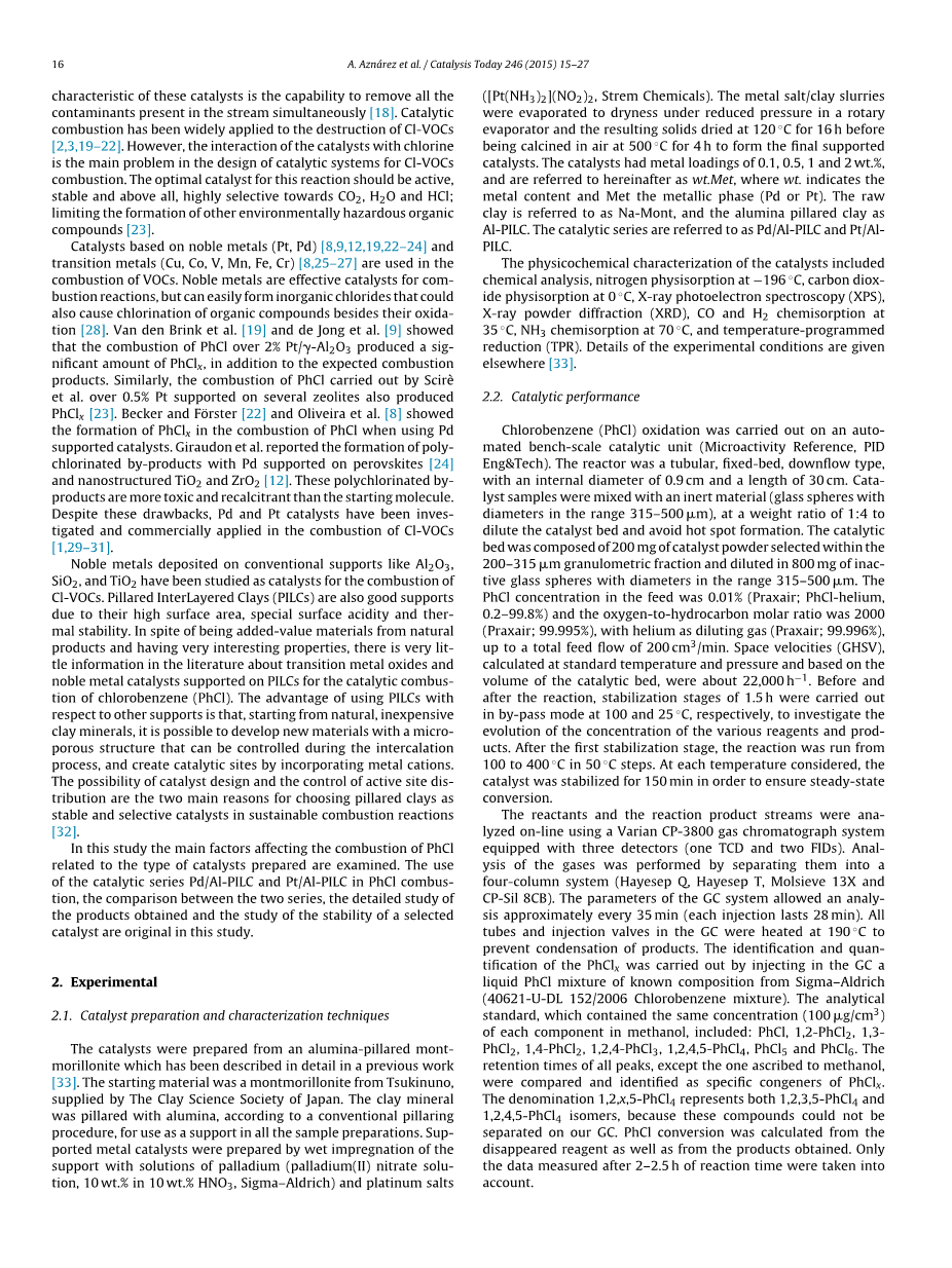 已经研究了负载在常规载体如Al2O3,SiO2和TiO2上的贵金属用来燃烧Cl-VOCs的催化剂。柱撑层间粘土(PILCs)由于其高表面积,特殊的表面酸度和热稳定性,所以是优良的载体。尽管是从天然产物而来的附加值材料并且具有非常意义的性质,但关于过渡金属氧化物和负载在PILC上用于催化燃烧氯苯(PhCl)的贵金属催化剂的文献资料却很少。使用PILCs与其他载体相比,其优势在于,从天然廉价的粘土矿物开始,在插层过程中能可控制地开发具有微孔结构的新材料,并通过结合金属阳离子制造催化位点。能够进行催化剂设计和控制活性点分布,这是选择柱撑粘土作为稳定性和选择性催化剂用于可持续燃烧反应的两个主要原因。