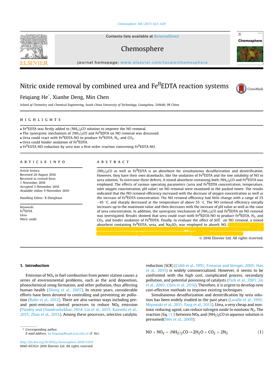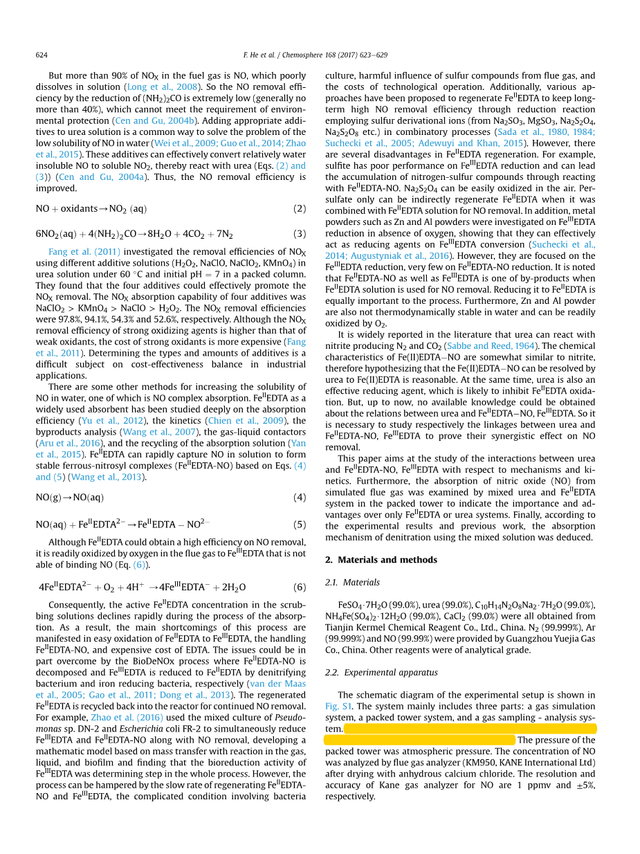 本文旨在研究尿素和FeIIEDTA-NO,FeIIIEDTA之间的相互作用的机理和动力学。此外,从一氧化氮(NO)的吸收模拟烟气由尿素和FeIIEDTA混合,检测系统在填充塔中显示出超过FeIIEDTA或尿素系统的重要性和优势。 最后,根据实验结果和以前的工作,推导出用混合溶液进行脱硝的吸收机理。