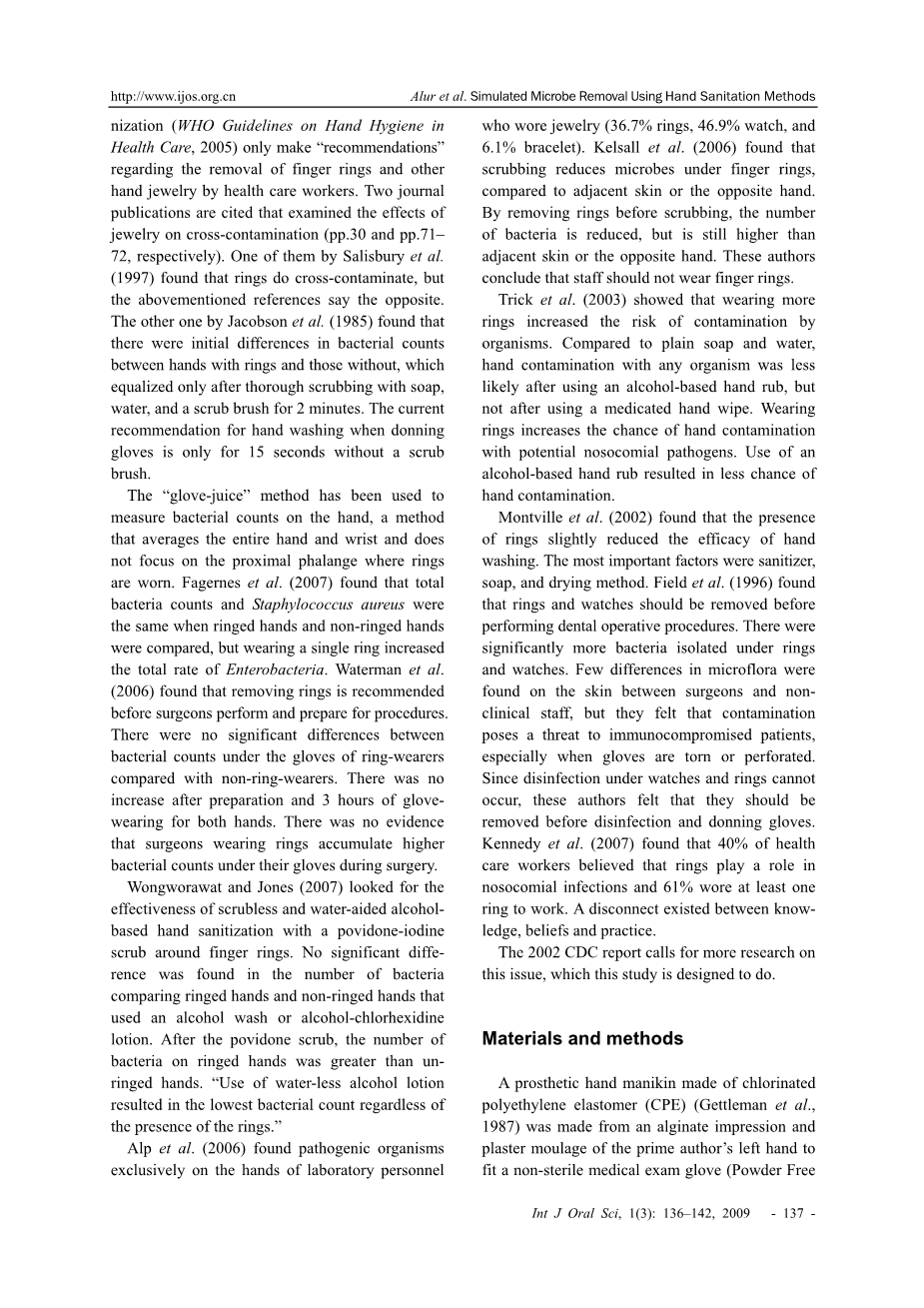 在本研究的条件下,佩戴戒指的手在流水下被刷洗的时间越长,拟微生物被去除的数量越多。只洗手5秒是无效的,尤其是只洗手掌。在洗手时间达到25秒时所有方法在根本上是相同的。清洁手掌没有清洁手背那么有效能去除拟微生物。在本研究中使用的洗手液时配合用温水比用冷水更有效。当必须在冷水下洗手且至多15秒,给定在有或没有肥皂中做选择时,这些实验结果表明,最好不要使用肥皂去除拟微生物。定性来说,清洗戒指外表面比清洗戒指下的缝隙更有效,并且镶有宝石的戒指拟微生物的积累和残留超过其他类型的戒指。由于清洗的戒指环隙的存在困难,在检查用手套下不应该戴戒指,否则会带来是病人和卫生保健工作者之间的交叉污染的后果。