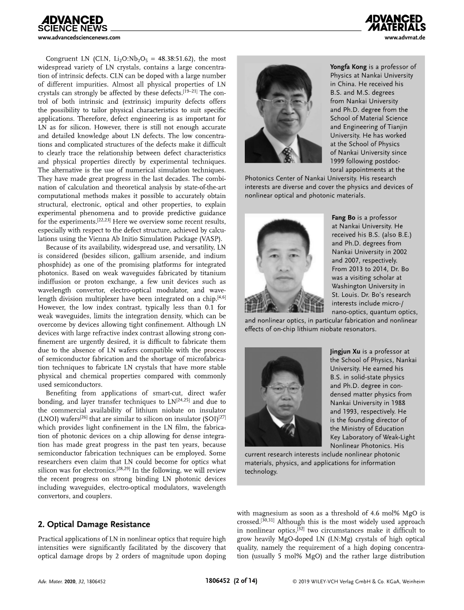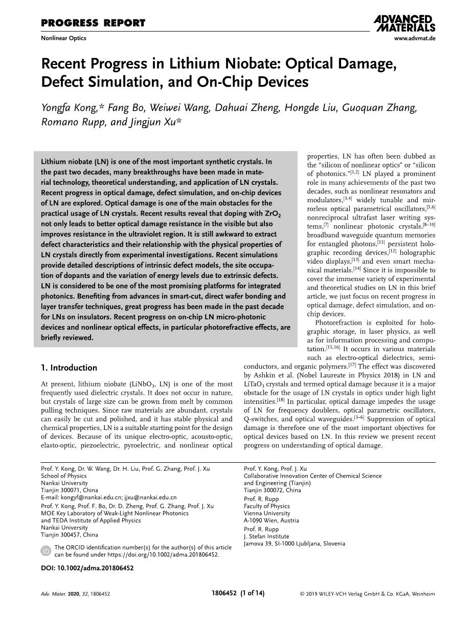 铌酸锂(LiNbO3,LN)是目前应用最广泛的材料之一常用的介电晶体。它不是自然发生的,但是大尺寸的晶体可以通过普通牵引技术从熔体中生长出来,由于原料丰富,晶体易于切割和抛光,具有稳定的物理和化学性质,LN对于设计设备是一个合适的设计起点。因为它独特的电光,声光,弹性光学、压电、热释电和非线性光学性质,LN经常被称为“非线性光学中的硅”或“光学中的硅”。LN在过去二十年的许多成就中扮演了一个重要的角色,如非线性谐振器和调制器、广泛可调且无镜的光学参量振荡器、非互易超快激光写入系统、非线性适用于纠缠光子的宽带波导量子存储器、持久全息记录设备、全息视频显示,甚至智能机械材料。因为这篇文章不可能涵盖各种各样的关于LN的实验和理论研究,我们只关注最近的在光学损伤、缺陷模拟和片上设备的进展。