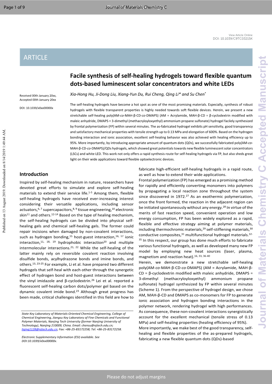 受自然界自愈合机制的启发,研究人员致力于模拟和探索自愈合材料以延长其使用寿命。1-5其中,柔性自愈合水凝胶因其多种用途而受到越来越多的关注,包括传感器致动器、6,7超级电容器、8,9组织工程、10电子皮肤11等。12-14根据愈合机制的类型,自愈合水凝胶可分为物理自愈合凝胶和化学自愈合凝胶。前者在被非共价相互作用如氢键、15主-客体相互作用、16,17离子相互作用、11,18,19疏水相互作用20和多个分子间相互作用损坏时可以修复切口。21,22而后者的自愈合主要依赖于涉及二硫键、酰腙键和亚胺键等的可逆共价反应。13,23-25例如,李等人已经制备了两种不同的水凝胶,它们通过氢键和乙烯基咪唑与beta;-环糊精之间的主-客体相互作用的协同作用而彼此自愈合。26雷等人报道了基于动态共价酰亚胺键的荧光自愈合碳点/聚合物凝胶。23虽然已经取得了很大的进展,但是在该领域中确定的关键挑战是如何快速地制备高效的自愈合水凝胶,以及如何扩展它们的广泛应用。自1972年发现以来,前端聚合(FP)已成为一种有前途的方法,通过在整个系统中传播局部反应区来快速有效地将单体转化为聚合物。27作为放热聚合,一旦前端形成,相邻区域的反应可以在没有任何能量的情况下自发引发。28由于反应速度快、操作方便和能耗低的优点,FP已被广泛探索为一种快速、高效的聚合方法。针对聚合物材料的灵活有效的策略,包括热致变色材料、29自硬化材料、30导电复合材料、31多功能水凝胶材料。32,35在这方面,我们的团队在制造各种功能性水凝胶方面做了大量工作,并通过采用新的热源(激光、等离子体、磁性和反应热)开发了许多新的FP模型。16,33,36-40在此,我们展示了由FP在几分钟内合成的新型可拉伸自愈合聚(AM-co-MAH-beta;-CD-co-DMAPS)(AM=丙烯酰胺,MAH-beta;-CD=马来酸酐改性的beta;-环糊精,DMAPS=3-二甲基(甲基丙烯酰氧乙基)丙烷磺酸铵)水凝胶(方案1)。从水凝胶设计的角度来看,我们选择了丙烯酰胺、马来酸酐-beta;-环糊精和二甲基丙烯酰胺作为共聚单体,在聚合物网络中产生离子缔合和氢键相互作用,使水凝胶具有高性能。因此,这些非共价相互作用协同解释了优异的机械性能(0.13兆帕的拉伸应力)和自愈合性能(95%的愈合效率)。更重要的是,我们充分利用了制备的水凝胶良好的透明性、自愈合性和柔韧性,制备了一种新型的柔性量子点发光太阳能聚光器(LSC)(方案1),以及基于量子点水凝胶的白色发光二极管。据我们所知,基于水凝胶基质的柔性LSC很少报道,这在柔性可穿戴设备和建筑领域非常有意义。这项工作提供了一个快速和灵活的途径来合成新的柔性LSC自愈合水凝胶,这给柔性光电器件的建设提供了新的见解。