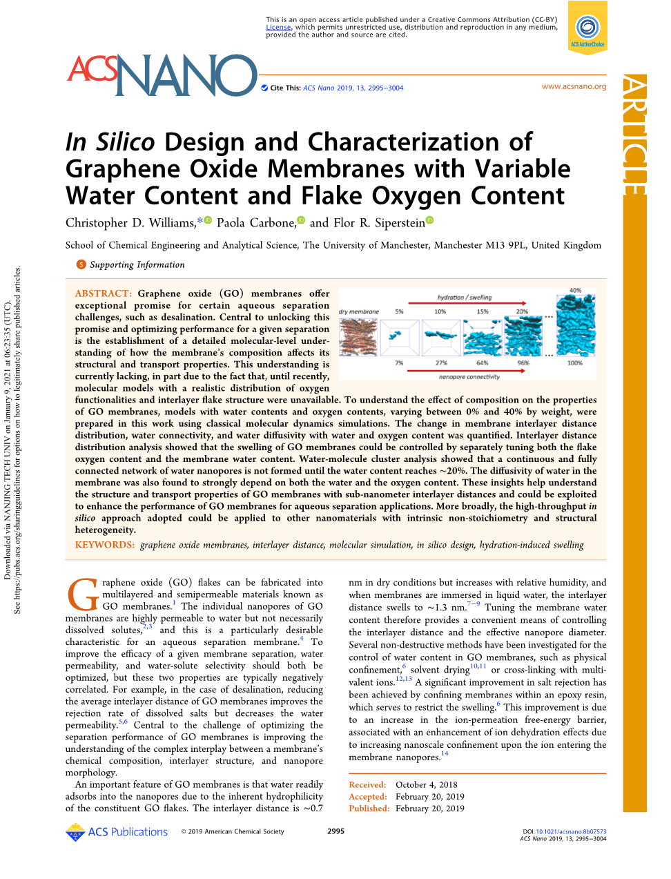摘要:氧化石墨烯(GO)膜为解决某些水分离难题(如脱盐)提供了特殊的前景。揭开这一前景和优化特定分离性能的核心是建立对膜的组成如何影响其结构和运输性质的分子水平的详细了解。这种理解目前是有缺陷的,部分原因是直到最近,还没有具有真实氧功能分布和层间鳞片结构的分子模型。为了了解氧化石墨烯膜的组成对膜性能的影响,本文利用经典分子动力学模拟方法制备了含水和含氧量在0% - 40%之间的模型。量化了膜间距离分布、水的连通性和水的扩散率随水和氧含量的变化。层间距离分布分析表明,分别调节鳞片氧含量和膜含水率可以控制氧化石墨烯膜的溶胀。水分子聚类分析表明,水纳米孔在水分含量达到约20%时才形成一个连续的、完全连通的网络。水在膜中的扩散系数也强烈地依赖于水和氧的含量。这些见解有助于理解亚纳米层间距离的氧化石墨烯膜的结构和传输特性,并可用于提高氧化石墨烯膜在水分离应用中的性能。更广泛地说,采用的高通量硅方法可以应用于其他具有本征非化学计量和结构非均匀性的纳米材料。