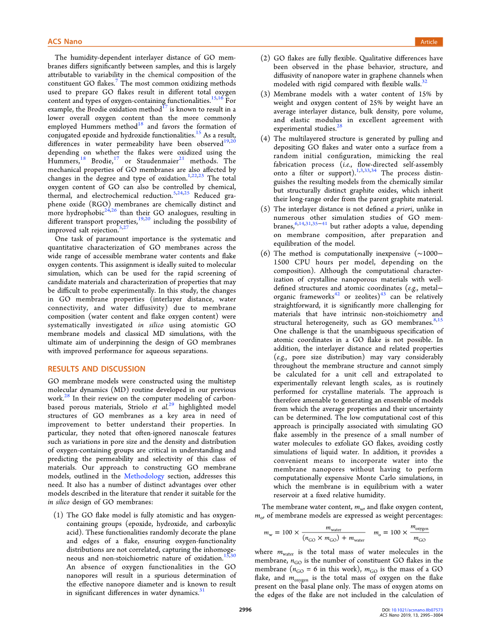 其中,mwater是膜中水分子的总质量,nGO是膜中氧化石墨烯薄片的组成数(在本研究中,nGO = 6), mGO是氧化石墨烯薄片的质量,moxygen是只存在于基面上的薄片上的氧的总质量。鳞片边缘的氧原子质量不包括在氧的计算中,因为它们的包含导致不具有代表性。低氧含量时,飞机表面氧密度低。这是一个有限大小的效应,因为与真正的氧化石墨烯薄片相比,边缘的相对贡献增加了,真正的氧化石墨烯薄片的尺寸要大得多。为了单独研究mw和mo对膜性能的影响,这些值从0%到40%,间隔5%。所研究的含水率范围可以不同程度的反映膜水合作用,从无水状态到完全膨胀状态(即浸没在液态水中)。对于每个膜组成(mw和mo),建立了10个模型,从中确定了平均性能和不确定度。因此,本研究共构建了180个GO膜模型。在氧含量恒定(mo = 25%, c - o原子比为4:1)的条件下,我们制备了mw可变的模型。采用标准氧化法(mo = 25% ~ 40%, c - o原子比在4:1 ~ 2:1之间)和还原氧化法(mo lt; 25%),选择氧化石墨烯的氧含量范围来反映氧化石墨烯的典型值。在一定数量的水分子(1067)下,我们制备了mo值可变的模型,对于mo =25%的膜,对应的是mw = 15%,这大致是环境湿度下膜的含水量的典型情况。