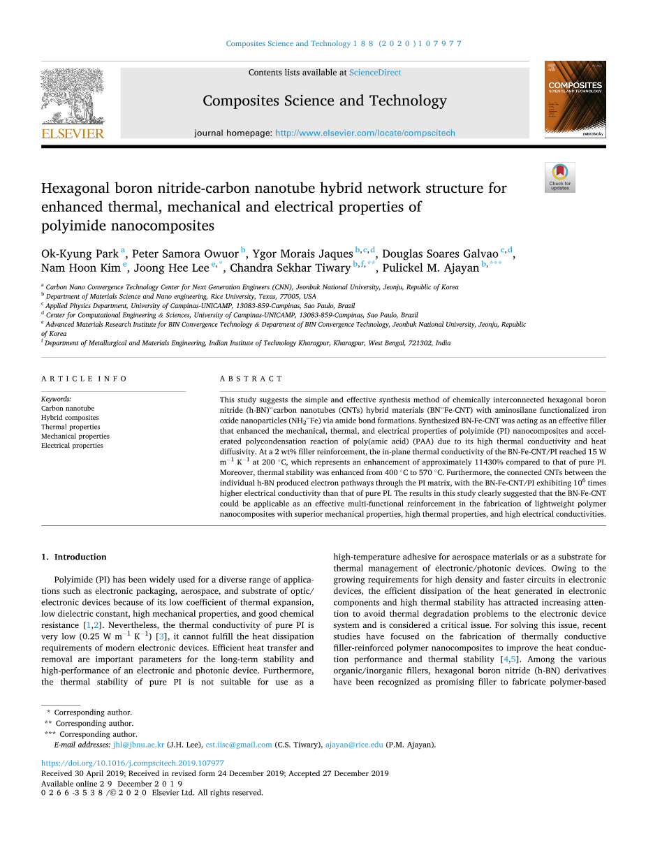 摘要:这项研究提出了一种简单有效的通过形成酰胺键将氨基硅烷官能化的氧化铁纳米粒子(NH2-Fe)与六方氮化硼(h-BN)–碳纳米管(CNTs)进行化学连接的合成方法。合成的BN-Fe-CNT具有较高的热导率和热扩散率,是提高聚酰亚胺(PI)纳米复合材料力学、热学和电学性能,加速聚酰胺酸(PAA)缩聚反应的有效填料。当填充量为2wt%,BN-Fe-CNT / PI的面内热导率在200°C时达到15 W m-1 K-1,与纯PI相比提高了约11430%。此外,热稳定性从400 C提高到570℃。单个h-BN之间连接的CNT通过PI基体产生电子通道,BN-Fe-CNT / PI的电导率是纯PI的106倍。这项研究的结果清楚地表明,BN-Fe-CNT可以作为一种有效的多功能增强材料,用于制造具有优异机械性能、高热性能和高电导率的轻质聚合物纳米复合材料。