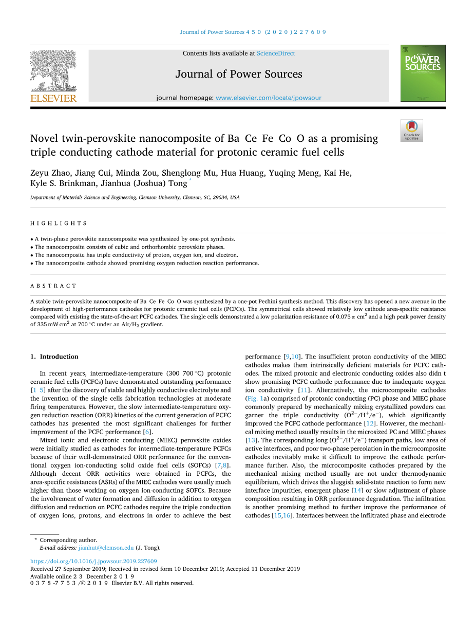 采用一步法合成了钡-铈-铁-钴-氧双钙钛矿纳米复合材料。这一发现为开发高性能质子陶瓷燃料电池阴极开辟了一条新途径。与现有的最先进的PCFC阴极相比,对称电池的阴极面积比电阻相对较低。在空气/氢气气氛下,单电池在700 ℃时具有0.075Omega;的低极化电阻和335 mW 的高峰值功率密度。