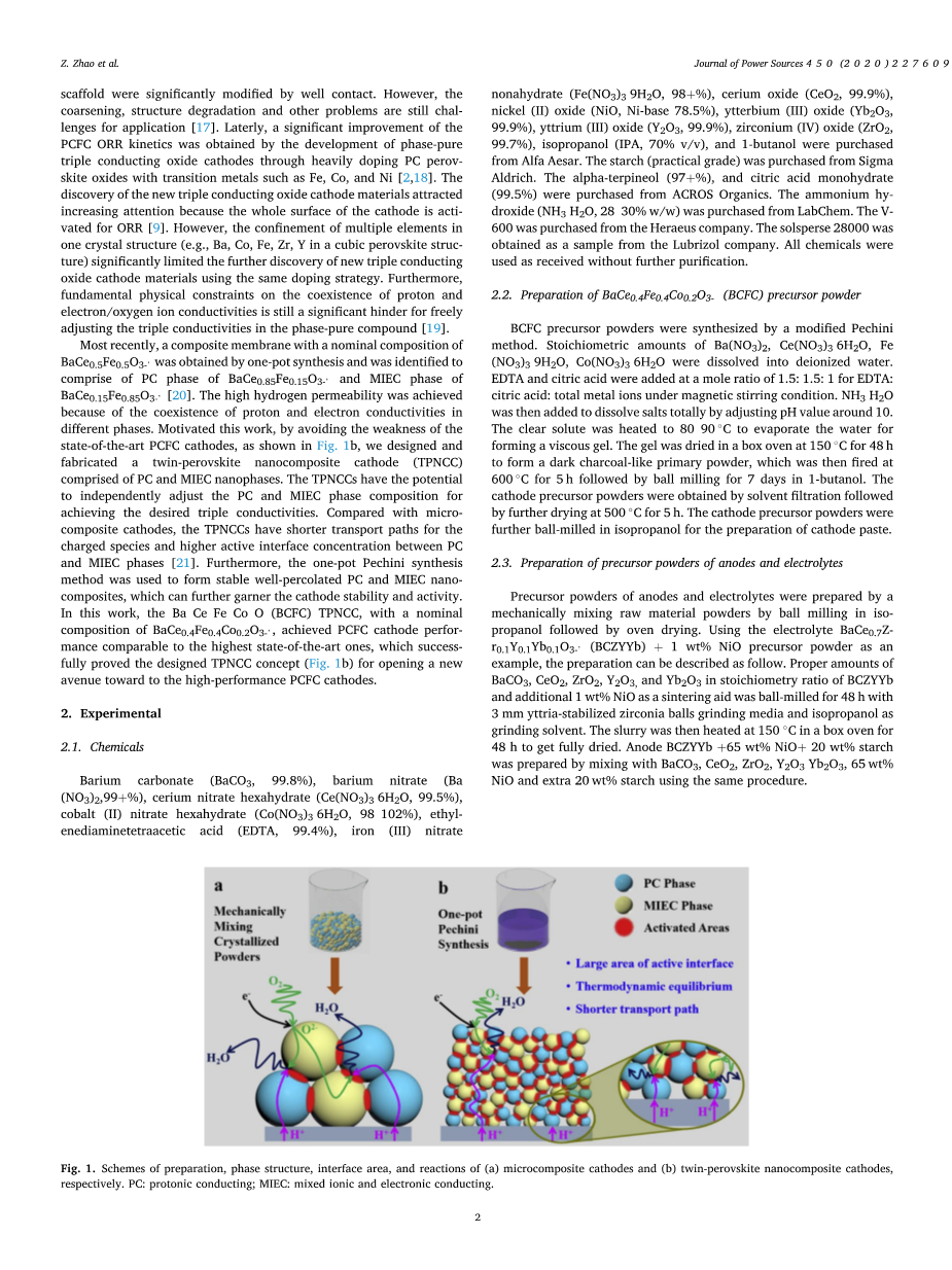 最近,通过一步法合成了一种标称成分为Ba的复合膜,它由Ba的PC相和Ba [20]的MIEC相组成。由于不同相的质子和电子电导率共存,因此获得了很高的氢渗透性。为了避免最先进的PCFC阴极(如图1b所示)的缺点,我们设计并制备了由PC和MIEC纳米相组成的双钙钛矿纳米复合阴极(TPNCC)。TPNCCs具有独立调整PC和MIEC相组成以实现所需的三重电导率的潜力。与微复合阴极相比,TPNCCs具有更短的带电物质输运路径和更高的PC相与MIEC相[21]的活性界面浓度。此外,采用一步法合成了稳定的多孔PC和MIEC纳米复合材料,进一步提高了阴极的稳定性和活性。这项工作中,标称组成为Ba的Ba-Ce-Fe-Co-O(BCFC)的TPNCC阴极性能达到了与最先进的PCFC阴极性能相当的水平。 技术上的成功,充分证明了设计的TPNCC概念(图1b)为高性能PCFC阴极开辟了新途径。