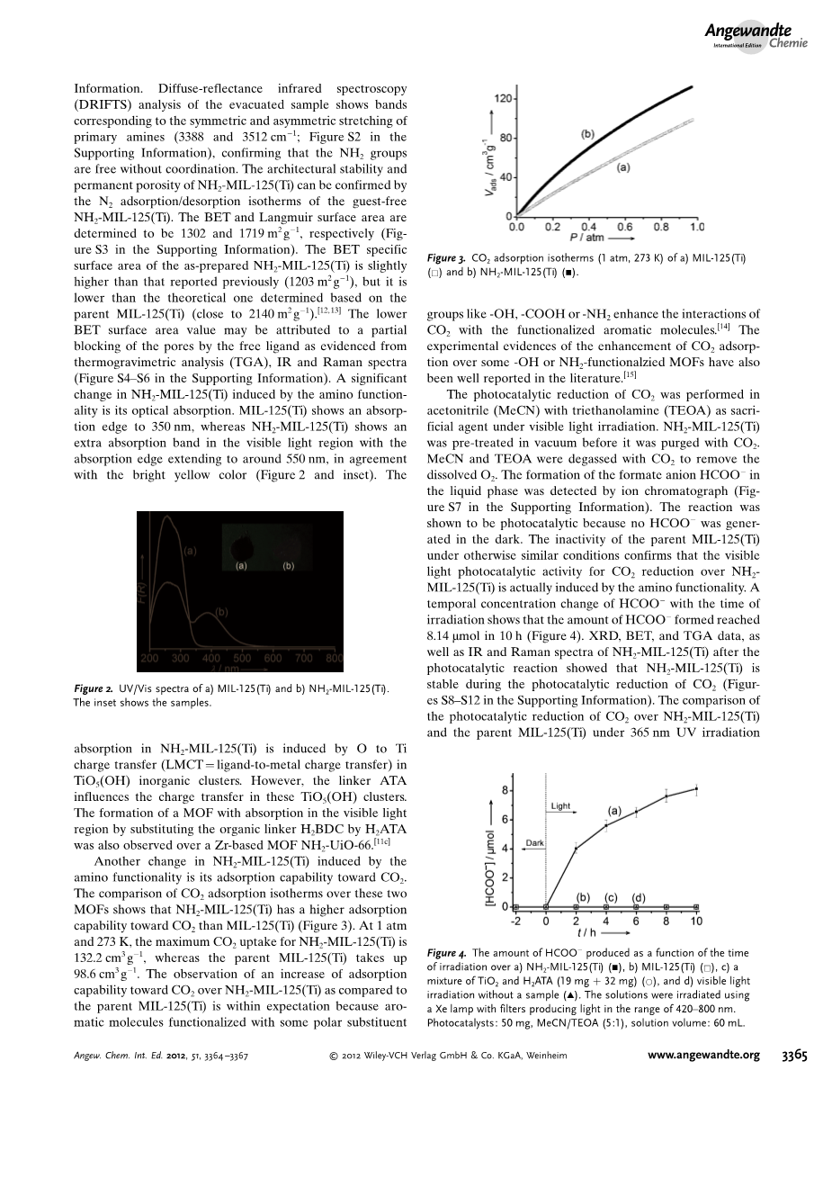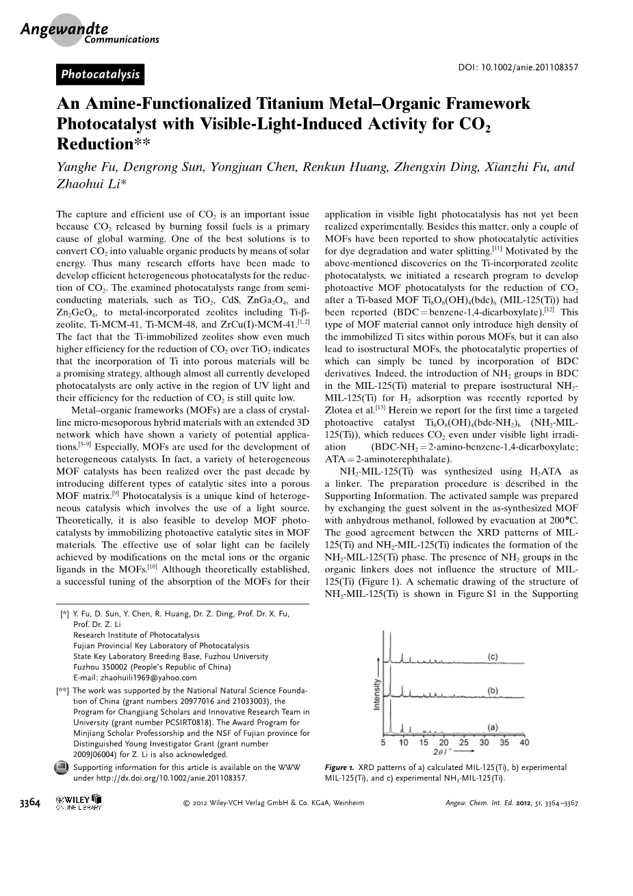 金属有机骨架(MOF)是一类具有扩展3D网络的晶状微介孔杂化材料,目前已经展示了多种潜在应用[3-9]。其中特别的是,MOF被用于非均相催化剂的开发。事实上,在过去十年,通过引入不同类型的催化位到一种多孔的MOF基质中,已经实现了多种非均相MOF催化剂[9]。光催化剂是涉及光源使用的一种特别的非均相催化剂。理论上,通过在MOF材料中固定光活性催化位来开发MOF光催化剂也是可行的。通过MOF里金属离子或有机配体的修饰,可以轻易达到太阳光的有效利用[10]。尽管理论上此种方法已经建立,但在可见光光催化的应用上,还没有从实验上实现对MOF吸收的成功调解。除此之外,只有几种展现出对染料降解和水分裂的光催化活性的MOF材料被报道 [11]。受到上述掺钛沸石光催化剂的启发,在钛基MOF--Ti 8 O 8 (OH) 4 (bdc) 6 (MIL-125(Ti))已经被发表之后(BDC是对苯二甲酸二甲酯),我们开始了一项开发催化二氧化碳还原的光活性MOF光催化剂的研究项目。这种MOF材料不仅可以在多孔MOF中引入高密度的固定钛位,还可以导致同构的MOF以及通过掺入BDC衍生物就可以容易地调整光催化性能。事实上, Zlotea等人最近发表了在MIL-125(Ti)材料中的BDC引入NH2基团来制备用于H2吸附的等结构NH2- MIL-125(Ti)。在此,我们首次发表一种甚至可以在可见光照射下还原二氧化碳的靶向光活性催化剂Ti8O8 (OH) 4 (bdc-NH2) 6 (NH2-MIL-125(Ti))(BDC-NH2是2-氨基-对苯二甲酸二甲酯,ATA是2-氨基对苯二甲酸酯)。