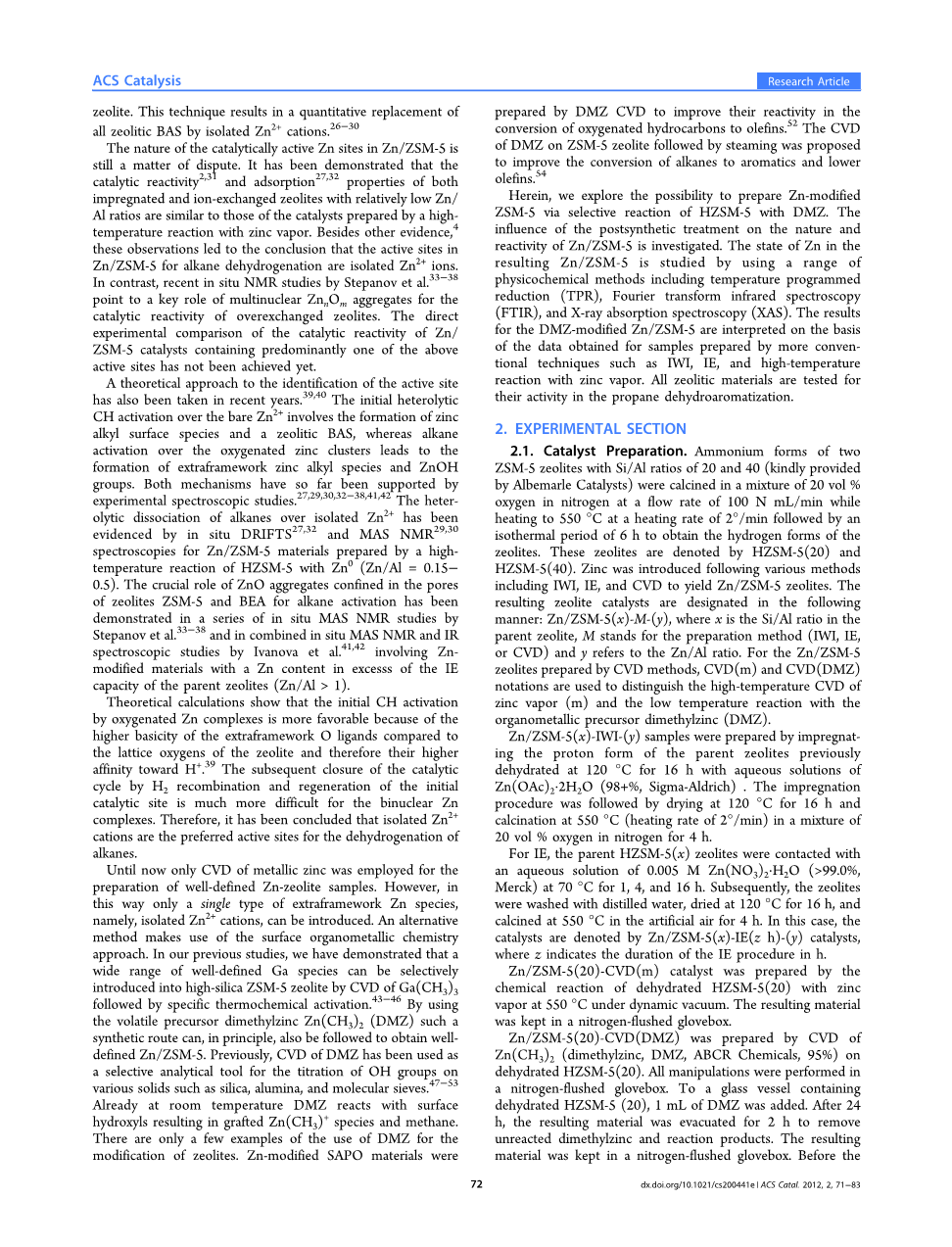Zn/ZSM-5中具有催化活性的Zn位的性质仍然是一个有争议的问题。结果表明,相对较低锌铝比的浸渍和离子交换分子筛的催化活性和吸附性能与锌蒸气高温反应制备的催化剂相似。除其他证据外,这些观察结果得出结论,Zn/ZSM-5中烷烃脱氢的活性中心是游离的离子。相比之下,Stepanov等人最近的原位NMR研究指出了多核锌聚集体对过交换分子筛催化活性的关键作用。主要含有上述活性中心的Zn/ZSM-5催化剂的催化活性的直接实验比较尚未实现。