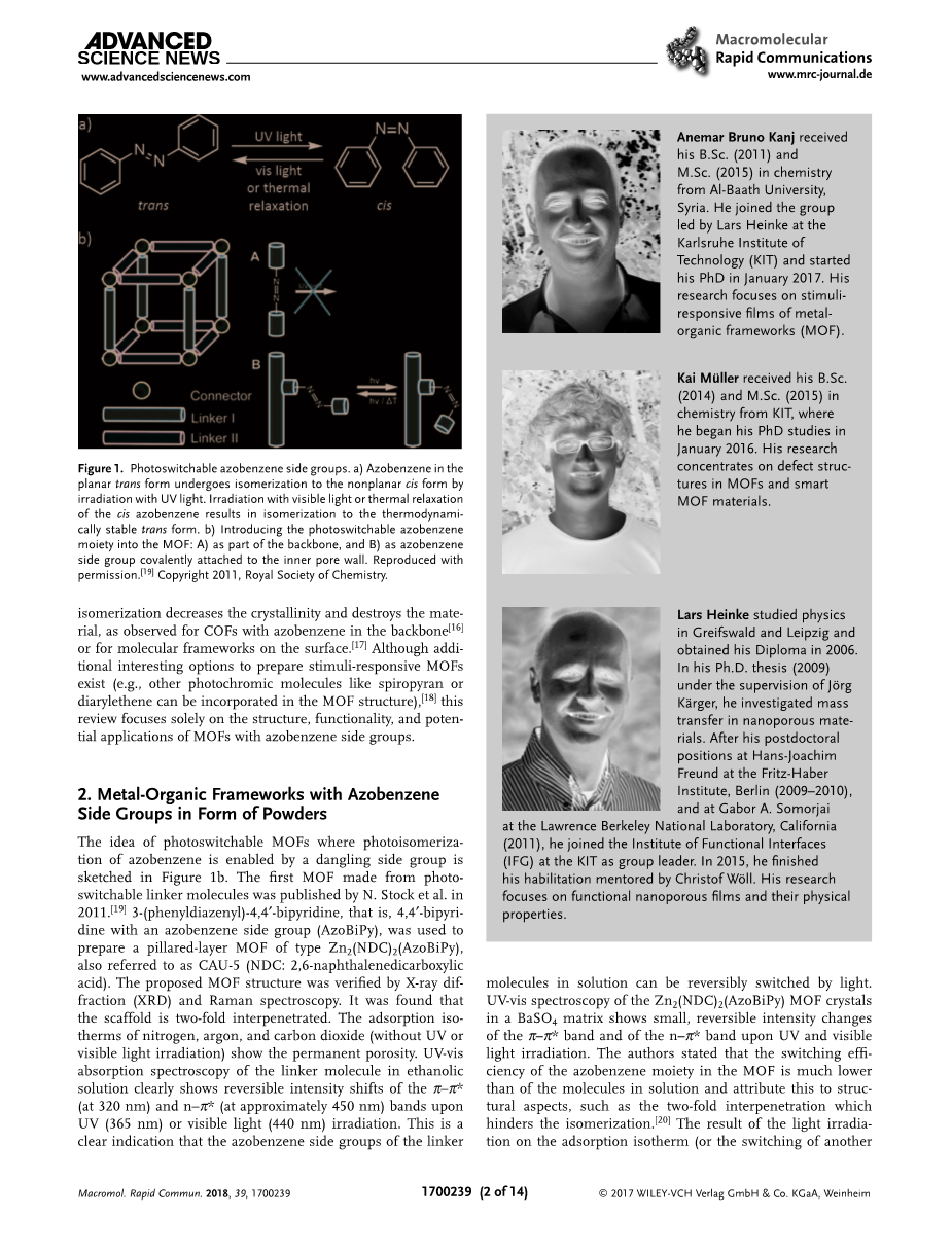 基于分子成分的光诱导变化的宏观智能材料的制备是当前的主要目标。引入偶氮苯的聚合物和液晶用作致动器和光驱动马达。另一类能够掺入光致变色分子的材料是金属有机框架。多孔膜是纳米多孔结晶固体,由金属节点和有机连接分子组成。这些材料具有许多独特的性质,如定义明确的周期性纳米多孔结构,具有非常大的比表面积。通过改变金属节点和/或接头分子,可以实现大的结构和化学变化。这些独特的性质使多孔膜对各种应用非常有吸引力,例如用于储存轻气体如H2、CH4或CO2,用于气体分离以及用于催化。