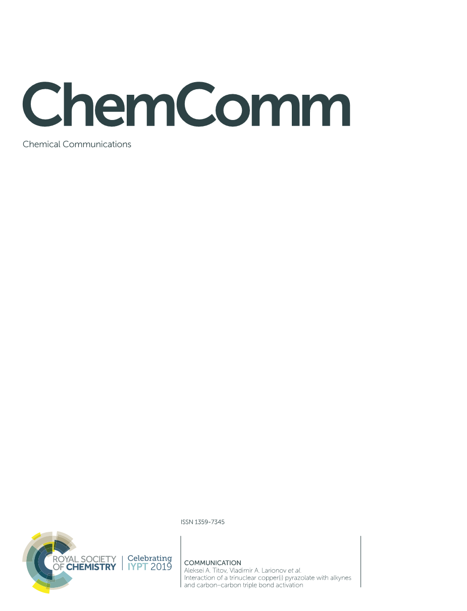 在这两种配合物中,每个铜(I)原子均通过M···pi;相互作用配位至乙炔片段(Cu与Cequiv;C键质心之间的距离对于3是1.879 Aring;,对于4是1.890 Aring;)。另外,C-C键长度在三键的典型范围内,对于3和4,C-C的长度分别为1.218和1.224 Aring;。此外,晶体3和4的固态红外光谱类似于溶液中的红外光谱,这意味着晶体3和4在固态和溶液中的结构相同(参见ESIdagger;中的图S9和S10)。由于三核大环化合物在低浓度下分解为单核(MPz)和双核(M2Pz2)物质,这可能是它们在炔烃存在下进行重组的驱动力,从而生成Cu3Pz4(eta;2-炔烃)配合物3和4。不幸的是,溶液中平衡的复杂性阻碍了可靠地估计3和4的形成常数。