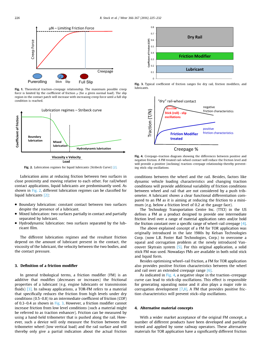 除了优化轮轨摩擦,用于TOR的FM还可以在扩展的爬电距离范围内在轮轨之间提供正摩擦特性。如图4所示,牵引-蠕变曲线中的负斜率会导致粘滑振动。这种效应负责产生尖叫声,并且在瓦楞纸的发展中也起着重要作用。提供正摩擦特性的FM可以防止粘滑现象。