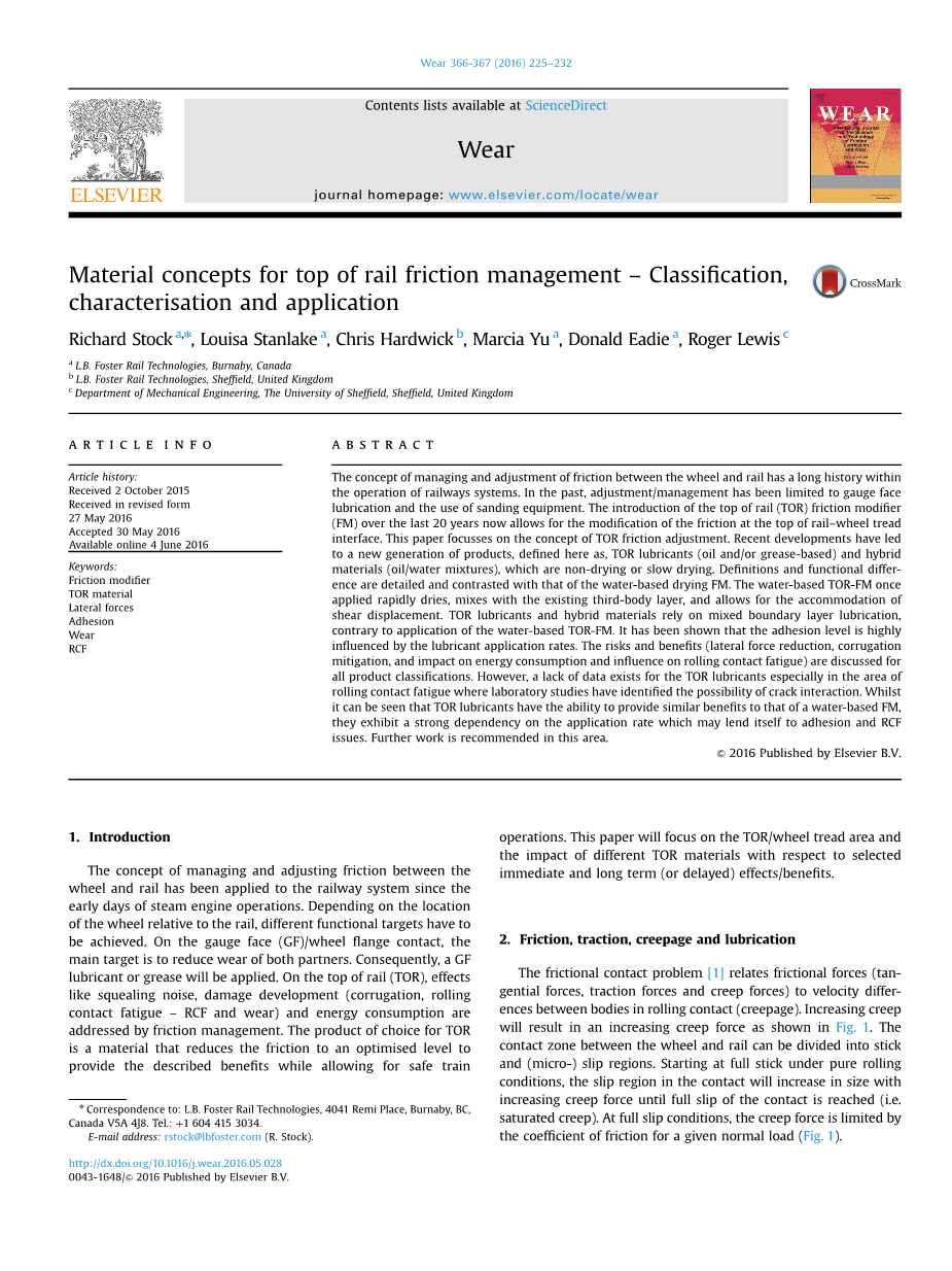 摘要:在铁路系统的运行中,管理和调整轮轨摩擦的概念由来已久。过去,调整/管理仅限于仪表杆表面润滑和打磨设备的使用。过去20年以来,采用了轨道顶部(TOR)摩擦调节剂(FM),从而可以改变轨道-车轮胎面界面顶部的摩擦。本文着重介绍TOR摩擦调整的概念。最近的发展已导致新一代产品,此处定义为不干燥或缓慢干燥的TOR润滑剂(油和/或油脂基)和混合材料(油/水混合物)。详细说明和功能差异,并与水基干燥FM进行对比。水性TOR-FM一经使用,便迅速干燥,并与现有的第三体层混合,并允许容纳剪切位移。 TOR润滑剂和混合材料依靠混合边界层润滑,这与水性TOR-FM的应用相反。已经表明,粘附水平受润滑剂施用率的高度影响。讨论了所有产品类别的风险和收益(降低侧向力,减少波纹,对能耗的影响以及对滚动接触疲劳的影响)。但是,对于TOR润滑剂缺乏数据,特别是在滚动接触疲劳领域,在实验室研究中已经确定了裂纹相互作用的可能性。虽然可以看出TOR润滑剂具有提供与水基FM相似的好处的能力,但它们对施用率表现出强烈的依赖性,这可能导致其粘附和RCF问题。建议在此区域做进一步的工作。
