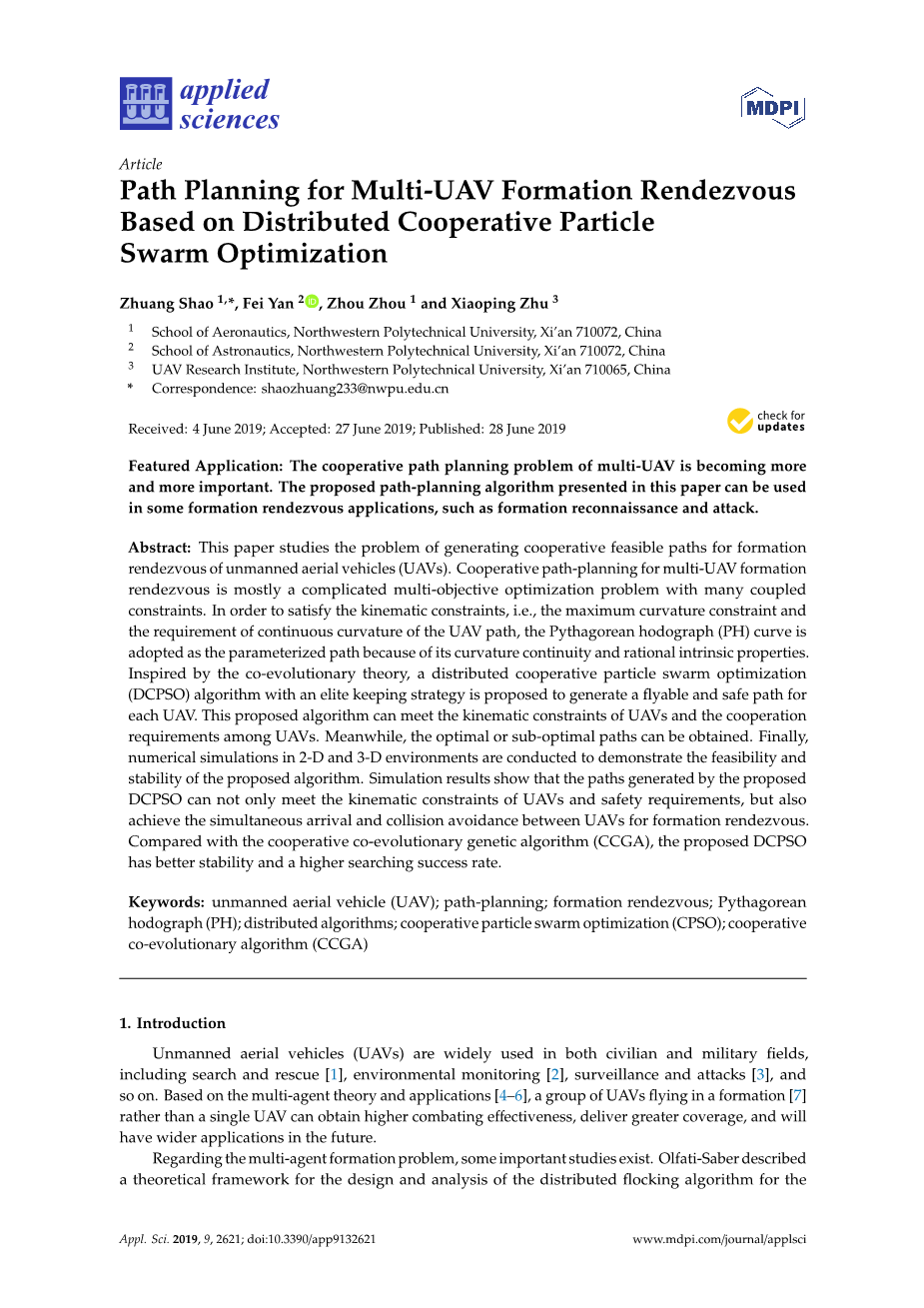 在本文中,重点是为同时到达集合点的无人机生成一组协作路径并形成所需的编队构型。提出了一种具有合作机制的分布式合作粒子群算法(DCPSO),这也是本文的主要贡献。通过使用DCPSO算法,可以对所有UAV的PH路径进行优化。使用分布式协作机制,修改每个子群中的粒子,从而实现了无人机的运动学约束,避免碰撞以及无人机编队同时到达。 同时,获得最佳或次优路径。