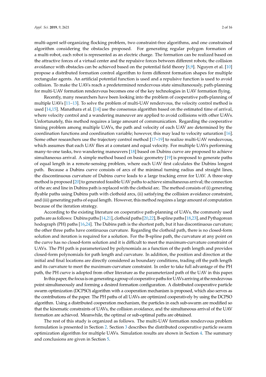 关于多主体形成问题,存在一些重要的研究。Olfati-Saber描述了一种理论框架,用于设计和分析用于所提出的障碍的多主体自组织植绒问题,两种无约束算法和一种约束算法。为了产生多机器人的规则多边形形成,将每个机器人表示为电荷。可以基于虚拟中心的吸引力和不同机器人之间的排斥力来实现该构造。根据势场理论可以实现避免障碍物的碰撞[8,9].Nguyen等[10]提出一种分布式编队控制算法,以为多个矩形主体形成不同的编队形状。使用了人工势函数,并且使用了排斥函数来避免碰撞。为了使无人机同时达到预定的交会状态,多UAV编队交会的路径规划成为无人机编队飞行的关键技术之一。最近,许多研究人员一直在研究多个无人机的协同路径规划问题[11–13].为了解决多无人机交会的问题,使用了速度控制方法[14,15].Manathara等[14]使用基于估计的到达时间的共识算法,其中应用速度控制和漂移操纵以避免与其他无人机发生冲突。不幸的是,这种方法需要大量的通信。关于多架无人机之间的协同计时问题,每架无人机的航路和速度由协调函数和协调变量确定。但是,这可能会导致速度饱和[16].其他一些研究人员使用轨迹控制方法[17–19]来实现多无人机交会,它假设每个无人机以恒定且相等的速度飞行。对于执行多对一任务的多架无人机,有两个徘徊的动作[18]提出了基于杜宾斯曲线的图来实现同时到达。一种基于基本几何形状的简单方法[19]提出了在遥感问题中生成等长路径的方法,其中每个无人机首先计算杜宾斯最长路径。由于杜宾斯曲线由最小转弯半径和直线的弧组成,因此杜宾斯曲线的不连续曲率会导致无人机产生较大的跟踪误差。提出了一种三步法[20]生成可行的无人机路径以实现同时到达;杜宾斯路径中的弧线连接被回旋弧取代。该方法包括(i)使用带有回旋弧的Dubins路径生成可飞行路径,(ii)满足防撞约束,以及(iii)生成等长路径。但是,由于迭代策略,这种方法需要大量的计算。