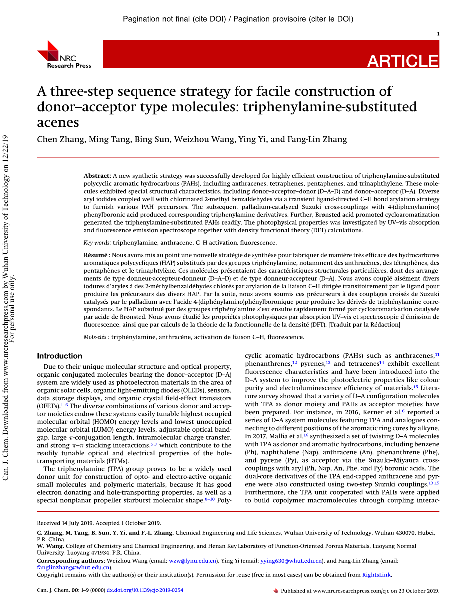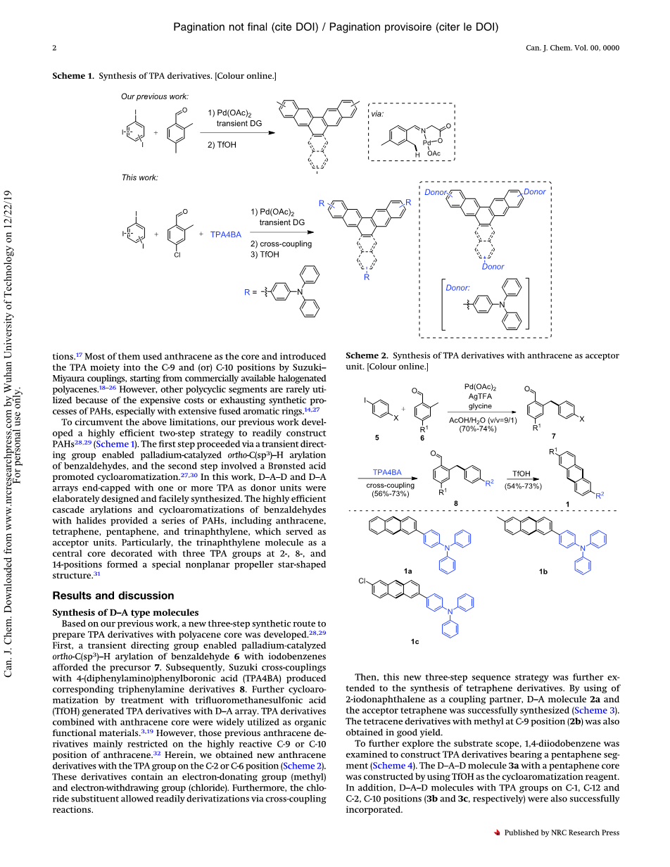 为了避免上述限制,我们以前的工作是选择了高效的两步策略来轻松构建PAHs(方案1)。第一步是通过瞬态导向基团使钯催化苯甲醛的邻位C()-H芳基化,第二步涉及Broslash;nsted酸促进的环芳构化。在这项工作中,以一个或多个TPA作为供体单位封端的D–A–D和D–A阵列精心设计并易于合成。苯甲醛卤代物的高效级联芳基化和环芳化产生一系列PAH,包括蒽、四苯、五苯和三萘嵌苯,其表现为受体单元。特别地,三萘嵌苯分子作为中央核心,在其2-、8-和14-位置上有三个TPA基团,形成了特殊的星形非平面螺旋结构体。