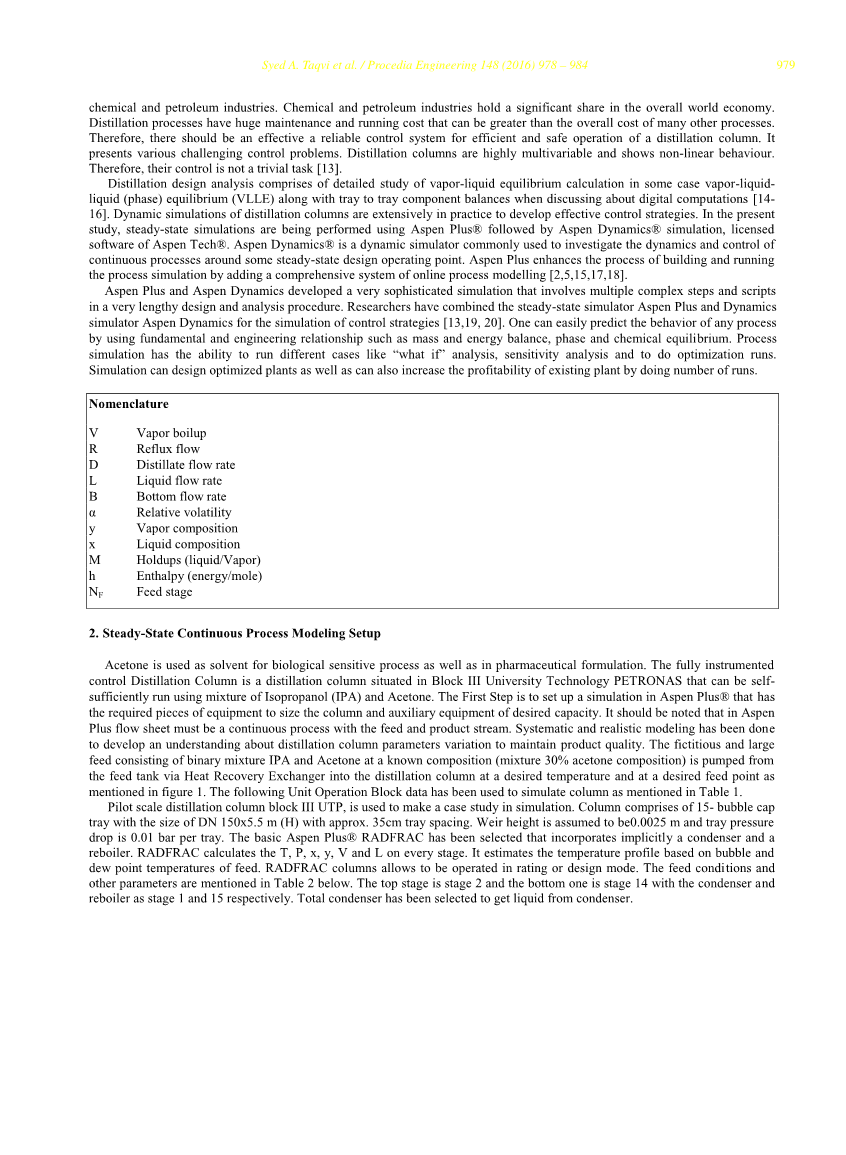 采用中试规模的精馏塔三段分离塔,进行了模拟实验研究。该塔由15个泡罩塔板组成,塔板大小为 dn 150x5.5 m (h) ,塔板间距约为35厘米。塔高假定为0.0025米,塔板压降为0.01 bar / 塔板。基本的Aspen Plusreg; RADFRAC已经被选中,隐含地包括一个冷凝器和一个再沸器,RADFRAC计算每个阶段的 t,p,x,y,v 和 l。它根据投料的泡点温度和露点温度来估算温度分布, RADFRAC塔在额定值或设计模式下操作。进料条件和其他参数见下文表2。 上级为第2级,下级为第14级,冷凝器和再沸器分别为第1级和第15级。 选用总冷凝器从冷凝器中提取液体。
