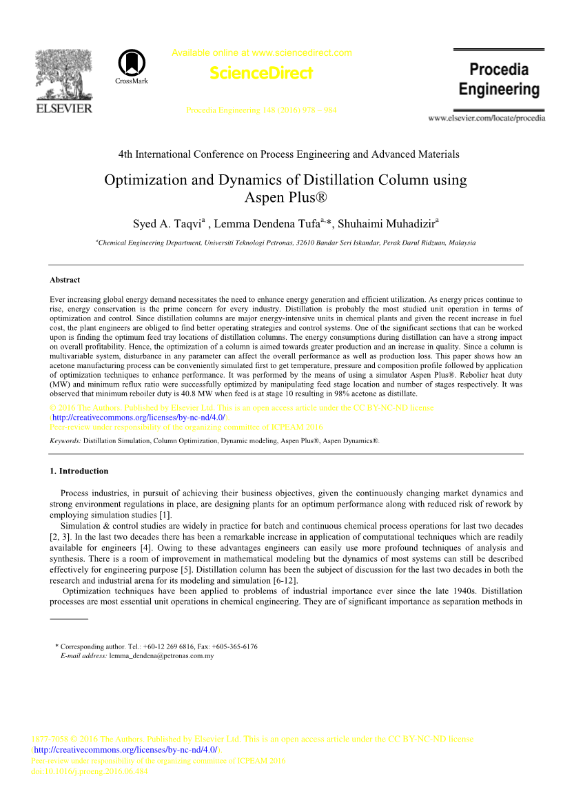 全球能源需求增加,需要加强能源生产和有效利用。随着能源价格继续提高,节能是每个工业的首要任务。就优化和控制而言蒸馏是最值得研究的操作单元。因为蒸馏塔是化工厂主要的能源密集型设备,考虑到最近燃料成本的上涨,工程师们不得不寻找更优操作流程和控制系统,其中一个可操作重要的部分是找到蒸馏塔的最优进料塔板的位置。精馏中的能源消耗对整体盈利很重要。因此,塔的优化旨在更高的产量和质量的提高,。因为一个塔是多元系统,任何参数的干扰可以影响整体表现和产物丢失,这篇论文展示丙酮生产过程怎样方便的模拟得到温度,压力和组分分布,然后应用优化技术去提高性能。他是通过使用模拟器Aspen Plus完成的。通过分别操纵进料塔板位置和塔板的数量来优化再沸器负荷和最小回流比。结果表明,在第十块塔板进料时,再沸器的最小负荷为40.8mw,丙酮馏出率为98%