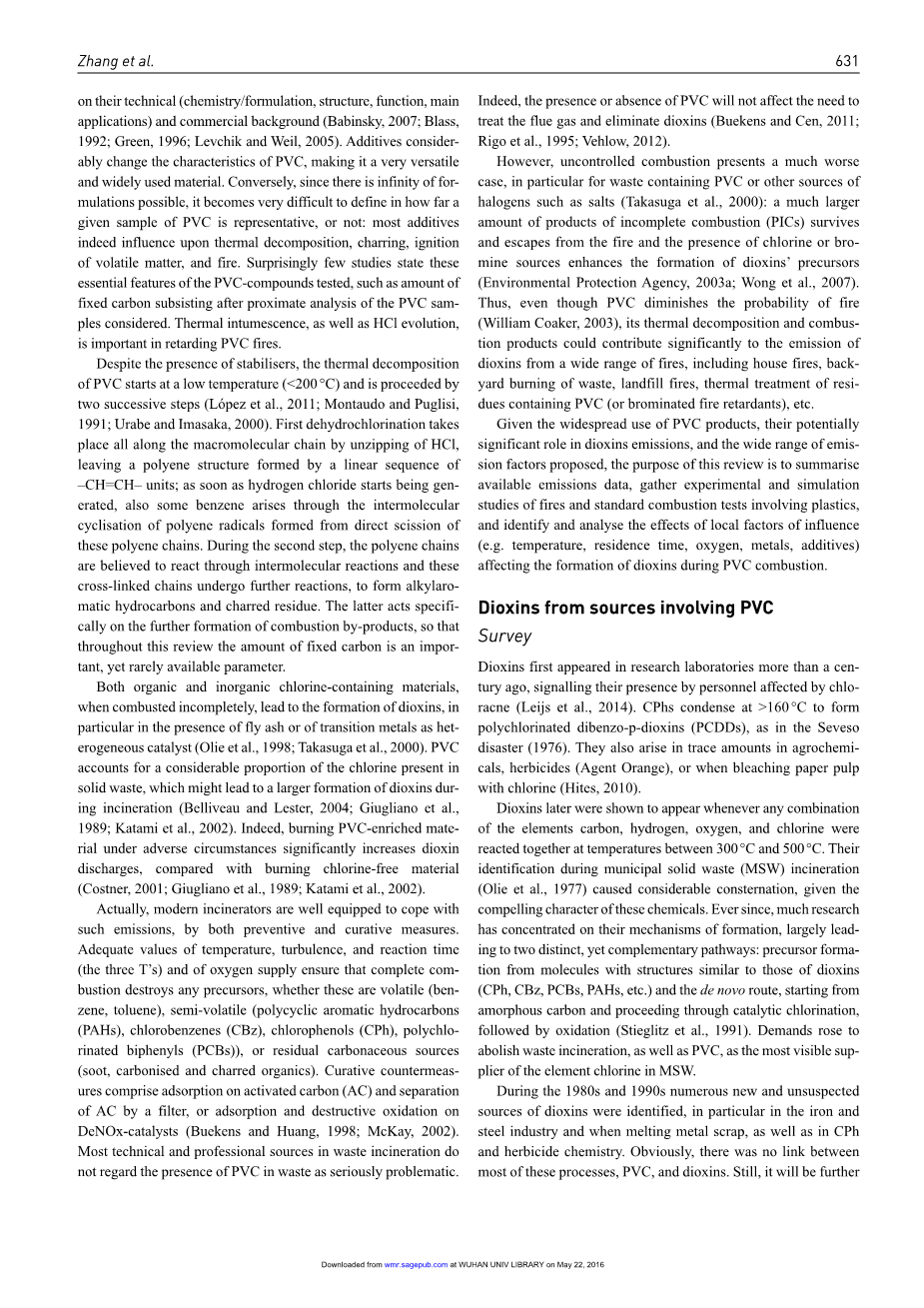 PVC的热分解会大量增加HCl和苯(lt;350°C)以及其他芳族化合物和焦油(McNeill等,1998)。关于二恶英的潜在形成,与氯气相比,HCl被认为是一种中等的氯化剂(Addink和Olie,1995)。形成PAH和二恶英的途径是基于次级或第三级产物的进一步转化,它们的形成可能取决于PVC的配方和热处理的精确条件。显然,这两个因素都没有得到充分的证明,因为配方仍然是保密的,火灾中的热工条件仍然不可预测。