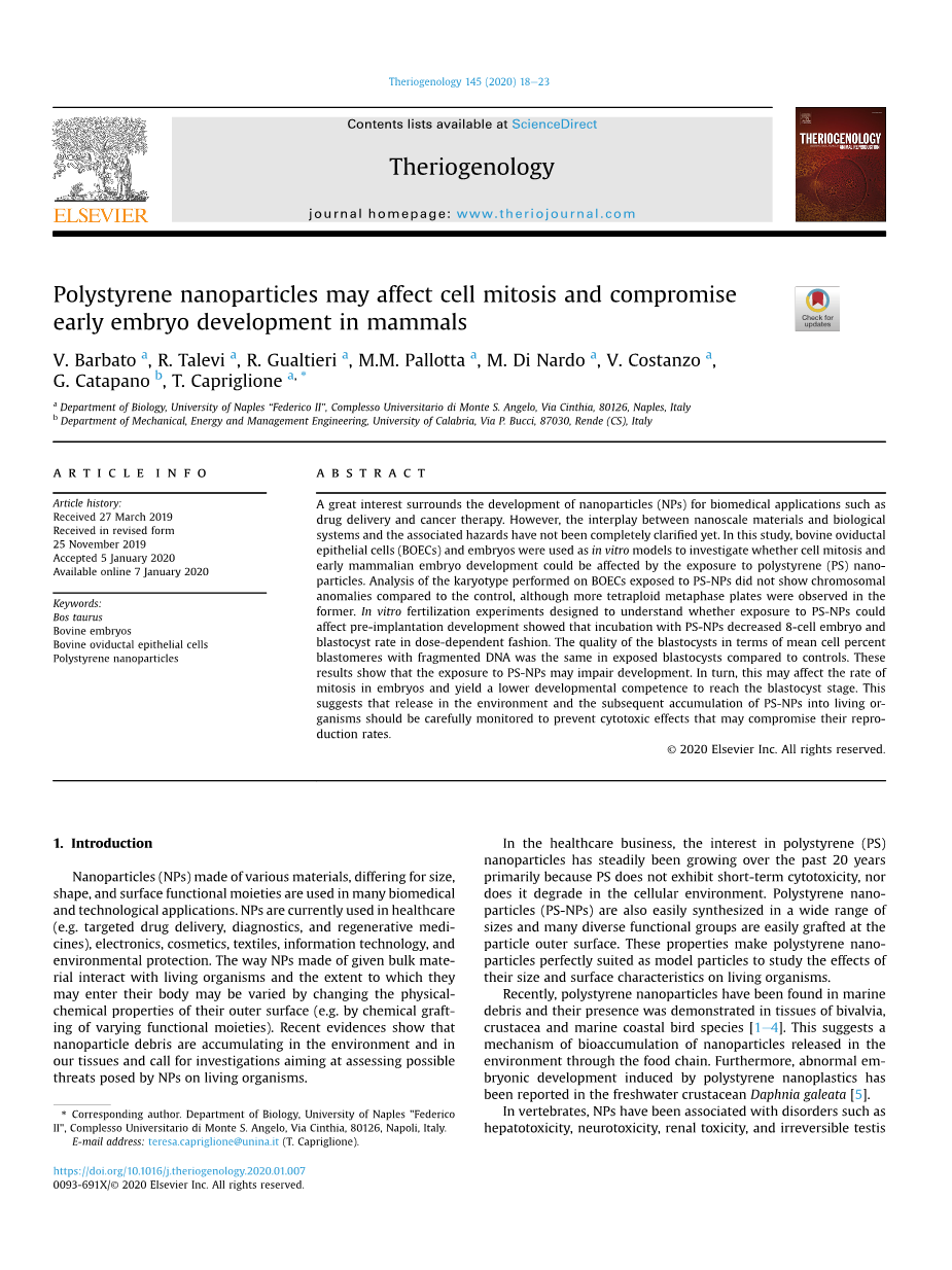 围绕生物医学应用的纳米颗粒(NPs)的开发比如药物输送和癌症治疗引起了极大的兴趣。然而,纳米级材料与生物之间的相互作用。然而,纳米级材料与生物之间的相互作用和相关的危害尚未完全阐明。在这项研究中,牛输卵管上皮细胞(BOEC)和胚胎被用作体外模型,以研究细胞是否有丝分裂和哺乳动物早期胚胎发育可能受到暴露于聚苯乙烯(PS)纳米颗粒的影响。 对暴露于PS-NPs的BOEC进行的核型分析未显示染色体与对照组相比异常,尽管在对照组中观察到更多的四倍体中期板。体外受精实验旨在了解暴露于PS-NPs是否会影响植入前的发育,结果表明,与PS-NPs孵育可以剂量依赖的方式降低8-细胞胚胎和囊胚率。 以平均细胞百分数表示的胚泡质量与对照相比,暴露的胚泡中具有片段化DNA的卵裂球相同。这些结果表明,暴露于PS-NPs可能会损害发育。 反过来,这可能会影响胚胎中的有丝分裂并导致到达胚泡阶段的发育能力降低。这个表示应仔细监测在环境中的释放以及随后PS-NPs向生物或生物体内的积累,以防止可能损害其复制率的细胞毒性作用。