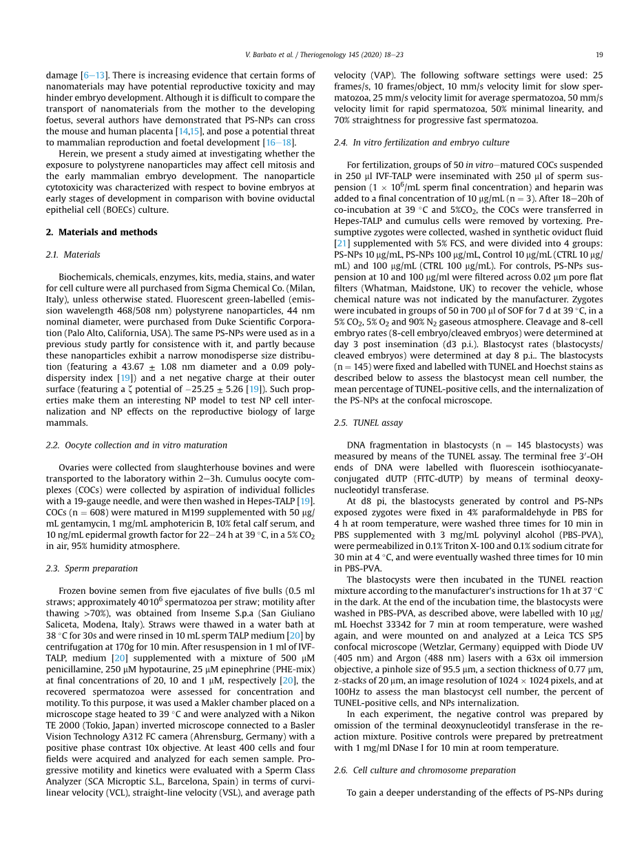 为了受精,用250mu;l精子悬浮液(1x10%/mL精子终浓度)对悬浮于250mu;lIVF-TALP中的50个体外成熟的COC组进行授精,并加入肝素使其终浓度为10微克/毫升(n = 3)。在39°C和5%CO2下共孵育18-20h后,将COC转移到Hepes-TALP中,并通过涡旋除去积云细胞【21】。预先收集假定的受精卵,在补充了5%FCS的合成输卵管液中洗涤,分为4组:PS-NP 10ug/mL,PS-NP 100ug/mL,对照10ug/mL(CTRL 10mu;g/mL)和100mu;g/mL(CTRL 100mu;g/mL)。对于对照,将10和100 ug/ml的PS-NPs悬浮液通过0.02mu;m孔平滤器(Whatman,Maidstone,英国)过滤,以回收载体,制造商未指明其化学性质。合子在39%的5%CO2、5%02和90%N2气态气氛中于50°C的700mu;ulSOF中孵育7天。于受精后第3天测定卵裂率和8-细胞胚率(8-细胞胚/卵裂胚)。在感染后第8天确定胚泡发生率(胚泡/卵裂的胚胎),将胚泡(n=145)固定并用TUNEL和Hoechst染色标记,如下所述,以评估胚泡平均细胞数,TUNEL阳性细胞的平均百分比,共聚焦显微镜观察PS-NPs的内在化。