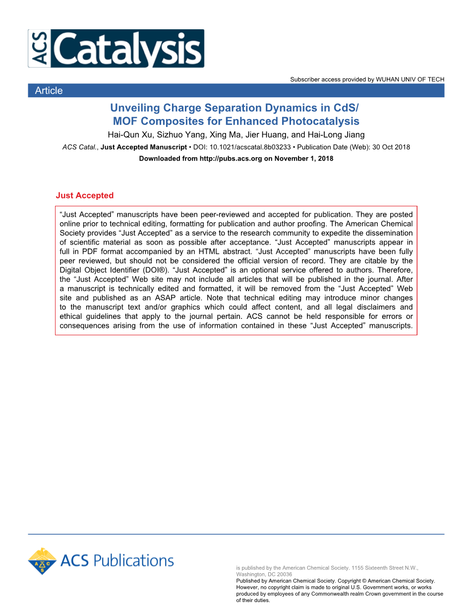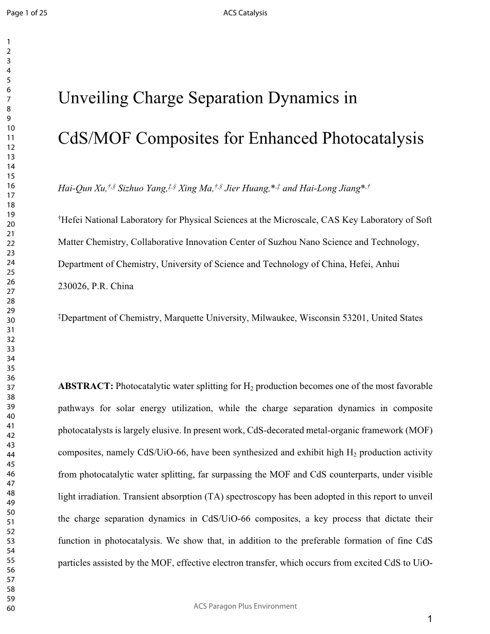 关键词:金属有机骨架,硫化镉,光催化,产氢,电荷分离动力学