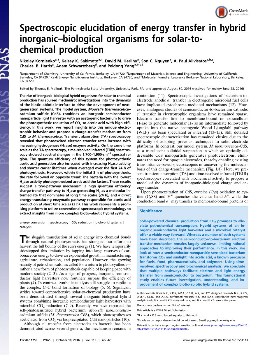 Nikolay Kornienkoa,1, Kelsey K. Sakimotoa,1, David M. Herlihya , Son C. Nguyena , A. Paul Alivisatosa,b,c, Charles. B. Harrisa , Adam Schwartzbergd , and Peidong Yanga,b,c,2