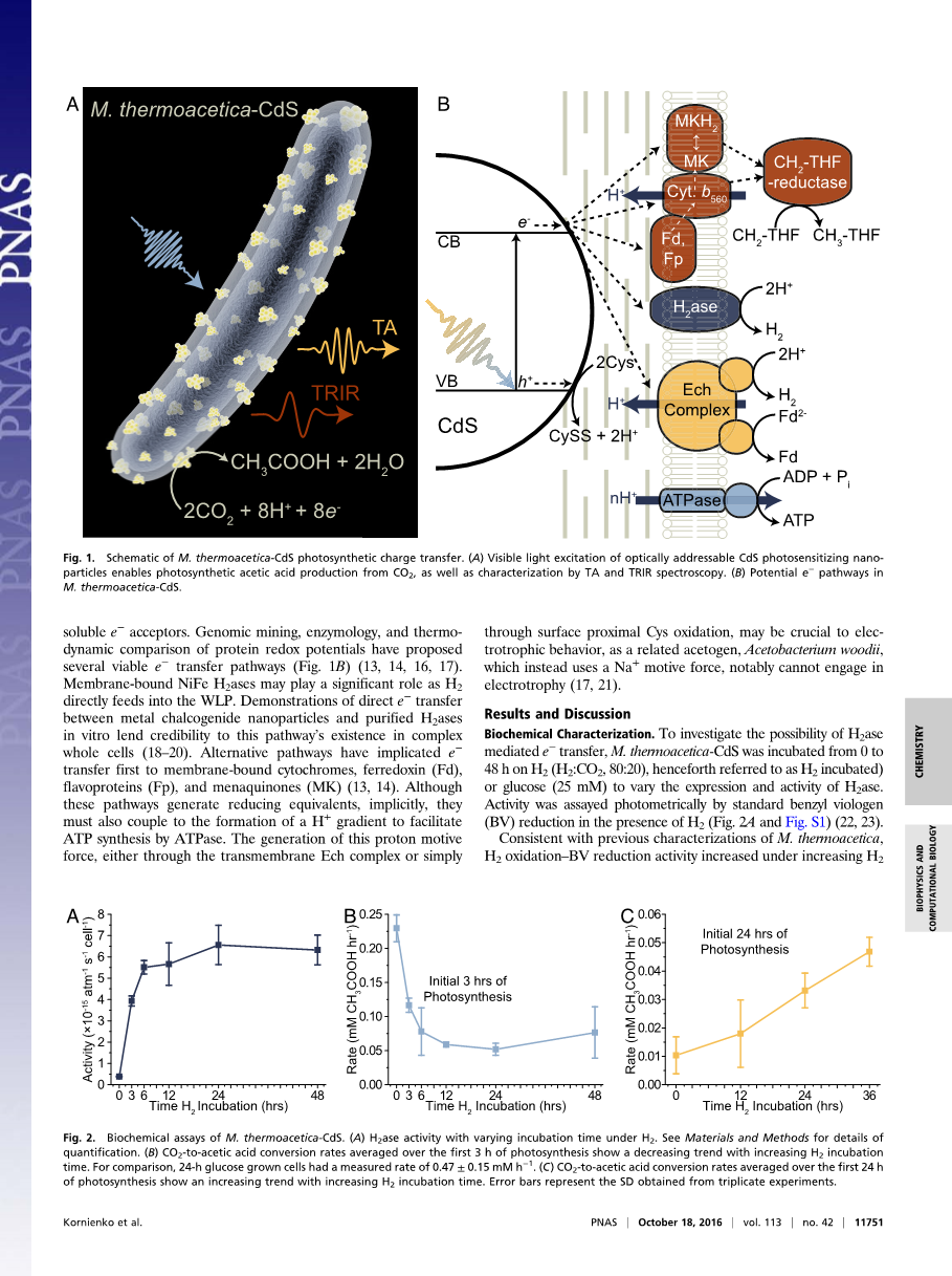 太阳能通过自然光合作用形成化学键的转化速率缓慢从而阻碍了我们试图获取全部太阳能量的工作(1)。我们通过利用有大量储存量的碳质能源暂时回避了这一局限性,并促进了工业、农业、城市和人口的快速发展。然而,石油化学品日益减少的情况需要光合作用的回归,一种能够与现代社会发展同步的新型光合作用(2,3)。作为一个进步的标志,无机半导体光收集器的效率普遍大于植物(4)。相比之下,合成催化剂仍然难以复制生物学中复杂的C-C键的形成(5,6)。通过对几种无机-生物混合体系即将无机半导体光收集器和微生物CO2减少量结合起来构成的混合体系的研究,对太阳能至化学品生产的理解已取得了重大进展(7-9)。近期,我们报告了一种自身光敏化的混合细菌M. thermoacetica-CdS,该细菌通过生物作用的CdS纳米粒子进行光合作用将CO2转化为乙酸(10)。