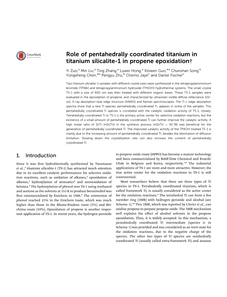 为了增加框架中的Ti含量,研究人员探索了另一种制备方法,称为气固替代法。通过这种方法,在ZSM-5的脱铝铝或B-ZSM-5的脱硼铝中产生了许多硅烷醇巢,然后将Ti原子植入这些巢中以获得Ti-ZSM-5。但是,较高的骨架Ti含量不会带来较高的催化活性,这可能是由于TS-1和Ti-ZSM-5中的Ti位置不同所致。此外,据报道,根据紫外可见扩散反射和紫外共振拉曼光谱的表征,具有Ti-O-Ti键的八面体配位骨架Ti是氧化反应的真正活性中心[14,15]。因此,认识到真正的活性中心对于进一步改善TS-1的活性非常重要。