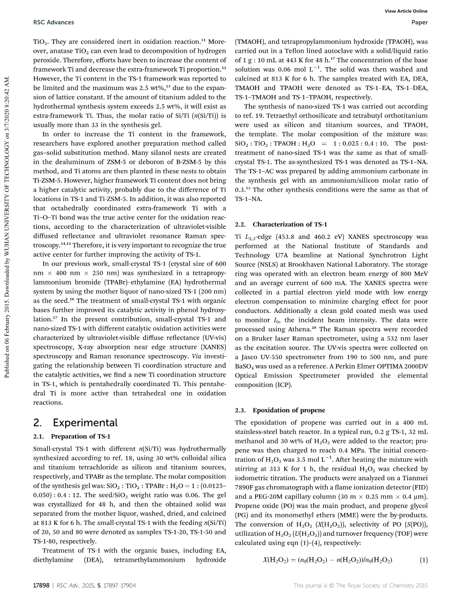 Ti的其他两种类型是八面体配位的Ti(通常称为骨架外Ti)和锐钛矿型TiO2。它们被认为对氧化反应是惰性的[11]。此外,锐钛矿型TiO2甚至会导致过氧化氢分解。因此,已经努力增加框架Ti的含量并降低框架外Ti的比例[12]。然而,据报道,TS-1骨架中的Ti含量受到限制,最大值为2.5wt%[13],由于晶格常数的扩大。如果添加到水热合成系统中的钛量超过2.5wt%,它将以骨架外Ti的形式存在。因此,在合成凝胶中Si/Ti的摩尔比(n(Si/Ti))通常大于33。